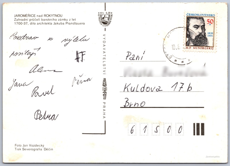 Jaroměřice nad Rokytnou, zámek Pokud chcete vidět pohlednice ve vyšším rozlišení nebo zobrazovat jejich zadní stranu, tak se prosím nejdříve přihlašte Přihlásit Zaregistrovat JAROMĚŘICE nad ROKYTNOUZahradní průčelí barokního zámku z let 1700 - 37, dílo architekta Jakuba Prandtauera Jazyk tištěného textu na pohlednici: čeština Jaroměřice nad Rokytnou, Třebíč ukázat na mapě Vydavatel: PressFoto Praha (Československo) Odhadované datum vydání pohlednice: 1980 - 1983 Pomozte nám zpřesnit rok vzniku pohlednice Velikost (š x v) a tvar pohlednice: 148 x 105 mm (5.83" x 4.13"), obdélník Osoby spjaté s touto pohlednicí: Jan Vozdecký(Autor fotografie) Jakub Prandtauer(Obsah pohlednice) Prošlá poštou Ceny: Příplatek na tur. ruch: 0,20 Kčs (CSK))Vyplacené známky: 0,50 Kčs (CSK) DiskuseVložit příspěvek Přidat novou složku ... Spravovat složky ...