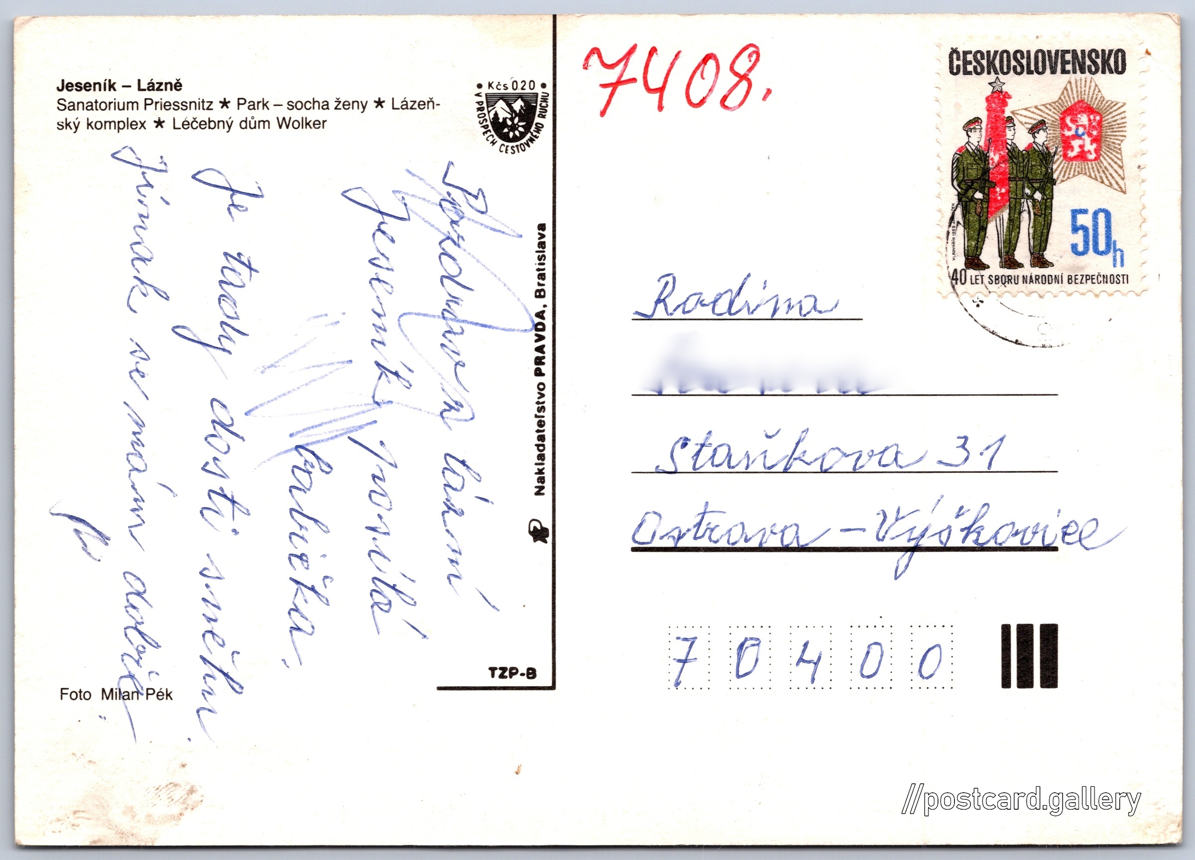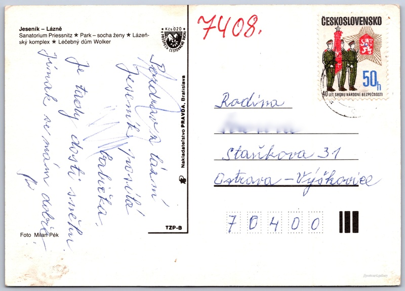 Jeseník, lázně Pokud chcete vidět pohlednice ve vyšším rozlišení nebo zobrazovat jejich zadní stranu, tak se prosím nejdříve přihlašte Přihlásit Zaregistrovat Jeseník - lázně Jeseník - Lázně- Sanatorium Priessnitz- Park - socha ženy- Lázeňský komplex- Léčebný dům Wolker Jazyk tištěného textu na pohlednici: čeština Jeseník, Jeseník ukázat na mapě Vydavatel: Nakladateľstvo PRAVDA, Bratislava (Československo) Datum vydání není známo Pomozte nám odhadnout datum vzniku pohlednice Velikost (š x v) a tvar pohlednice: 148 x 106 mm (5.83" x 4.17"), obdélník Osoby spjaté s touto pohlednicí: Milan Pék(Autor fotografie) Prošlá poštou Ceny: Příplatek na tur. ruch: 0,20 Kčs (CSK))Vyplacené známky: 0,50 Kčs (CSK) DiskuseVložit příspěvek Přidat novou složku ... Spravovat složky ...