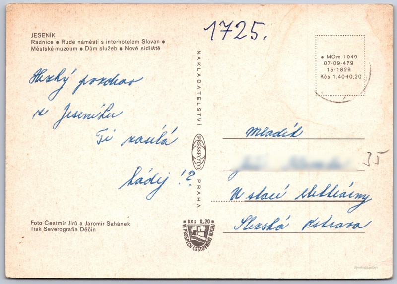 Jeseník 4/4 Pokud chcete vidět pohlednice ve vyšším rozlišení nebo zobrazovat jejich zadní stranu, tak se prosím nejdříve přihlašte Přihlásit Zaregistrovat Jeseník JESENÍK- Radnice- Rudé náměstí s interhotelem Slovan- Městské muzeum- Dům služeb- Nové sídliště Jazyk tištěného textu na pohlednici: čeština Masarykovo nám. 167/1, Jeseník, 790 01, Jeseník ukázat na mapě Vydavatel: PressFoto Praha (Československo) Rok vydání pohlednice: 1974 Velikost (š x v) a tvar pohlednice: 148 x 105 mm (5.83" x 4.13"), obdélník Osoby spjaté s touto pohlednicí: Jaromír Sahánek(Autor fotografie) Čestmír Jírů(Autor fotografie) Prošlá poštou Ceny: Cena pohlednice: 1,40 Kčs (CSK) (+0,20 Kčs přípl. na tur. ruch) Kódy na pohlednici: •MOm 1049 07-09-479 15-1829 DiskuseVložit příspěvek Přidat novou složku ... Spravovat složky ...