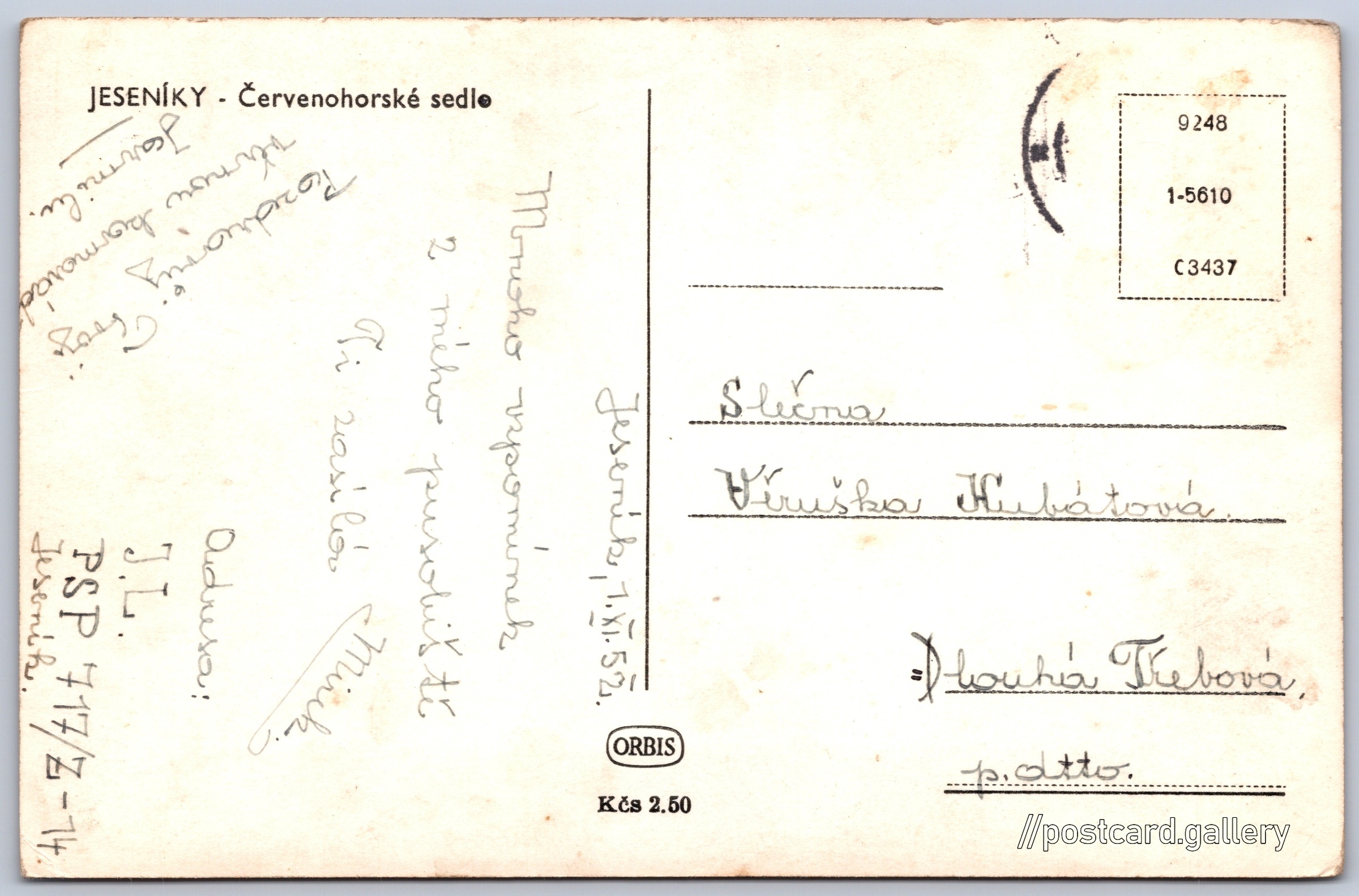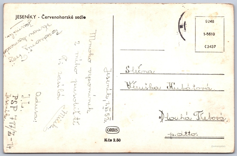 Jeseníky, Červenohorské sedlo Pokud chcete vidět pohlednice ve vyšším rozlišení nebo zobrazovat jejich zadní stranu, tak se prosím nejdříve přihlašte Přihlásit Zaregistrovat JESENÍKY - Červenohorské sedlo Jazyk tištěného textu na pohlednici: čeština Kouty nad Desnou, Loučná nad Desnou, Šumperk ukázat na mapě V blízkém okolí místa zobrazeného na pohlednici lze najít 9 jiných pohlednic. Zobrazit blízké pohlednice Vydavatel: Nakladatelství Orbis (Československo) Odhadované datum vydání pohlednice: 1949 - 1952 Pomozte nám zpřesnit rok vzniku pohlednice Velikost (š x v) a tvar pohlednice: 138 x 91 mm (5.43" x 3.58"), obdélník Prošlá poštou:Datum na razítku: 1.11.1952Datum napsání pohledu: 1.11.1952 Ceny: Cena pohlednice: 2,50 Kčs (CSK) Kódy na pohlednici: 9248 1-5610 C3437 DiskuseVložit příspěvek Přidat novou složku ... Spravovat složky ...