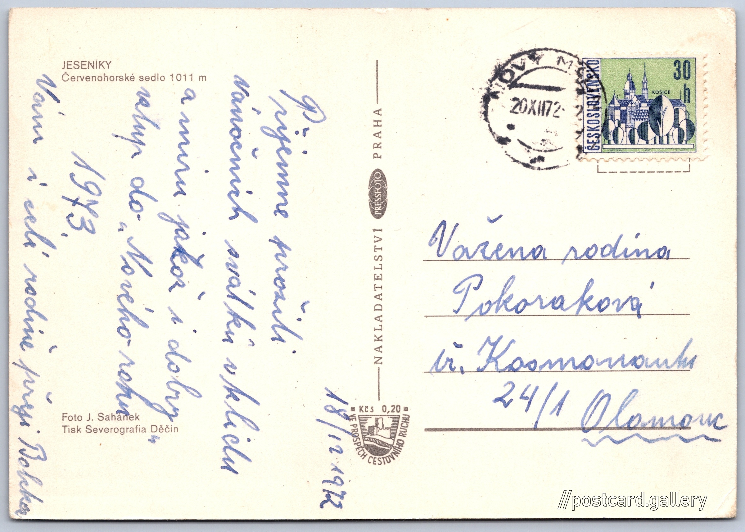 Jeseníky, Červenohorské sedlo 7/9 Pokud chcete vidět pohlednice ve vyšším rozlišení nebo zobrazovat jejich zadní stranu, tak se prosím nejdříve přihlašte Přihlásit Zaregistrovat JESENÍKYČervenohorské sedlo 1011 m Jazyk tištěného textu na pohlednici: čeština Bělá, Bělá pod Pradědem, Jeseník ukázat na mapě V blízkém okolí místa zobrazeného na pohlednici lze najít 11 jiných pohlednic. Zobrazit blízké pohlednice Vydavatel: PressFoto Praha (Československo) Odhadované datum vydání pohlednice: 1969 - 1972 Pomozte nám zpřesnit rok vzniku pohlednice Velikost (š x v) a tvar pohlednice: 148 x 103 mm (5.83" x 4.06"), obdélník Osoby spjaté s touto pohlednicí: Jaromír Sahánek(Autor fotografie) Prošlá poštou:Datum na razítku: 20.12.1972Datum napsání pohledu: 18.12.1972 Ceny: Příplatek na tur. ruch: 0,20 Kčs (CSK))Vyplacené známky: 0,30 Kčs (CSK) DiskuseVložit příspěvek Přidat novou složku ... Spravovat složky ...