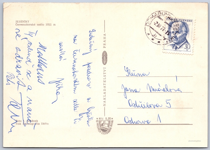 Jeseníky, Červenohorské sedlo Pokud chcete vidět pohlednice ve vyšším rozlišení nebo zobrazovat jejich zadní stranu, tak se prosím nejdříve přihlašte Přihlásit Zaregistrovat JESENÍKYČervenohorské sedlo 1011 m Jazyk tištěného textu na pohlednici: čeština Červenohorské sedlo (1013 m), Horské sedlo, Loučná nad Desnou, Česko ukázat na mapě V blízkém okolí místa zobrazeného na pohlednici lze najít 11 jiných pohlednic. Zobrazit blízké pohlednice Vydavatel: PressFoto Praha (Československo) Odhadované datum vydání pohlednice: 1974 - 1977 Pomozte nám zpřesnit rok vzniku pohlednice Velikost (š x v) a tvar pohlednice: 148 x 105 mm (5.83" x 4.13"), obdélník Osoby spjaté s touto pohlednicí: Jaromír Sahánek(Autor fotografie) Prošlá poštou:Datum na razítku: 2.3.1977 Ceny: Příplatek na tur. ruch: 0,20 Kčs (CSK))Vyplacené známky: 0,30 Kčs (CSK) DiskuseVložit příspěvek Přidat novou složku ... Spravovat složky ...