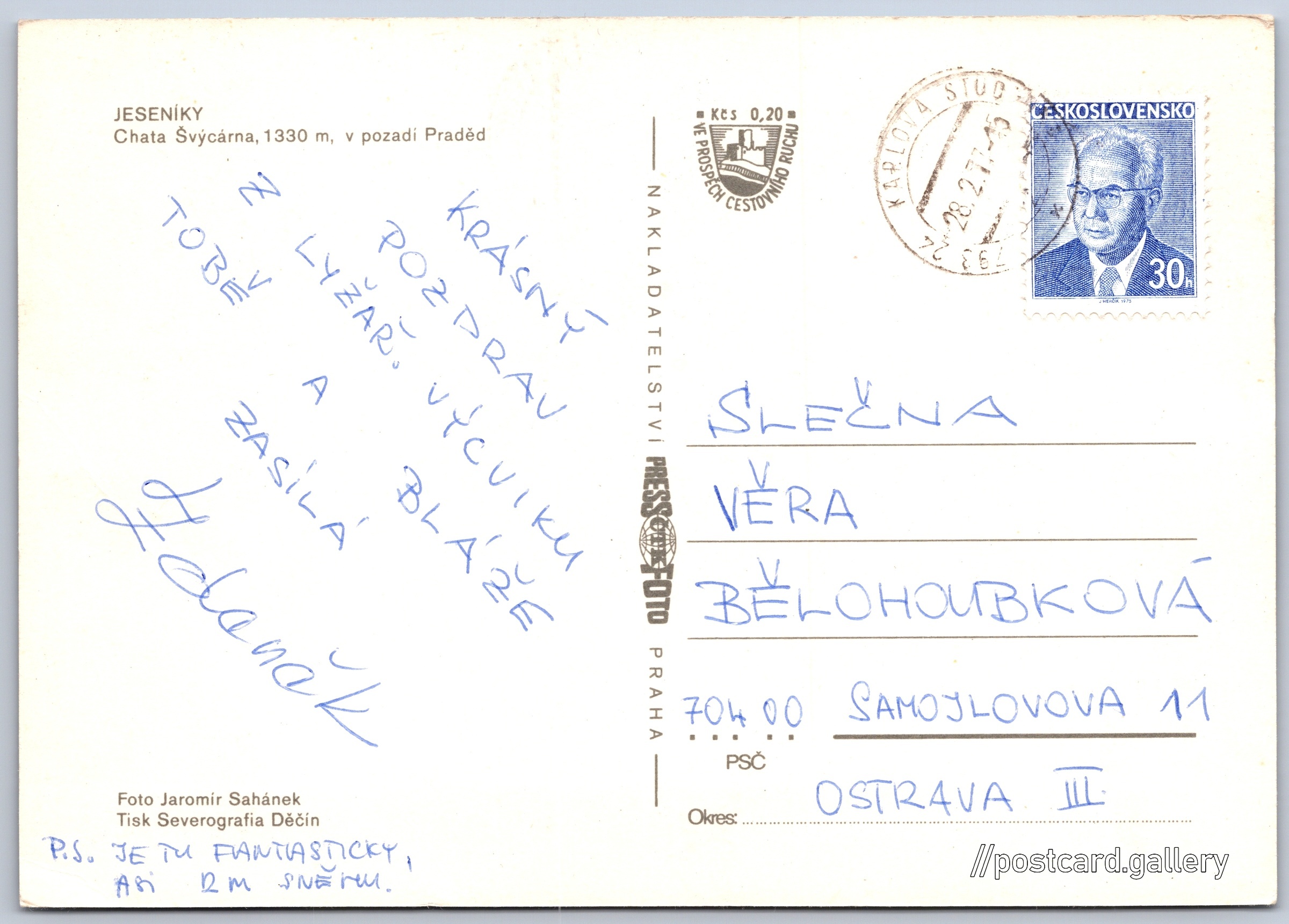 Jeseníky, chata Švýcárna Pokud chcete vidět pohlednice ve vyšším rozlišení nebo zobrazovat jejich zadní stranu, tak se prosím nejdříve přihlašte Přihlásit Zaregistrovat JESENÍKYChata Švýcárna, 1330 m, v pozadí Praděd Jazyk tištěného textu na pohlednici: čeština Chata Švýcárna, Historická budova, Kouty nad Desnou 74, Loučná nad Desnou - Kouty nad Desnou, Česko ukázat na mapě V blízkém okolí místa zobrazeného na pohlednici lze najít 31 jiných pohlednic. Zobrazit blízké pohlednice Vydavatel: PressFoto Praha (Československo) Odhadované datum vydání pohlednice: 1974 - 1977 Pomozte nám zpřesnit rok vzniku pohlednice Velikost (š x v) a tvar pohlednice: 148 x 105 mm (5.83" x 4.13"), obdélník Osoby spjaté s touto pohlednicí: Jaromír Sahánek(Autor fotografie) Prošlá poštou:Datum na razítku: 28.2.1977 Ceny: Příplatek na tur. ruch: 0,20 Kčs (CSK))Vyplacené známky: 0,30 Kčs (CSK) DiskuseVložit příspěvek Přidat novou složku ... Spravovat složky ...