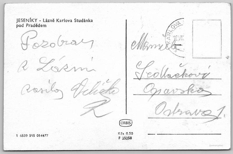 Jeseníky, Karlova Studánka Pokud chcete vidět pohlednice ve vyšším rozlišení nebo zobrazovat jejich zadní stranu, tak se prosím nejdříve přihlašte Přihlásit Zaregistrovat JESENÍKY - Lázně Karlova Studánka pod Pradědem Jazyk tištěného textu na pohlednici: čeština Karlova Studánka, Bruntál ukázat na mapě V blízkém okolí místa zobrazeného na pohlednici lze najít 13 jiných pohlednic. Zobrazit blízké pohlednice Vydavatel: Nakladatelství Orbis (Československo) Rok vydání pohlednice: květen, 1955 Velikost (š x v) a tvar pohlednice: 139 x 90 mm (5.47" x 3.54"), obdélník Prošlá poštou Ceny: Cena pohlednice: 0,50 Kčs (CSK) Kódy na pohlednici: 1 6539 555 014477 F 25258 DiskuseVložit příspěvek Přidat novou složku ... Spravovat složky ...