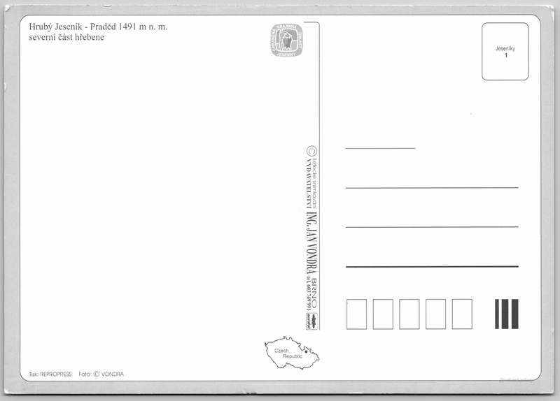 Jeseníky, letecký pohled Pokud chcete vidět pohlednice ve vyšším rozlišení nebo zobrazovat jejich zadní stranu, tak se prosím nejdříve přihlašte Přihlásit Zaregistrovat Jeseníky Hrubý Jeseník - Praděd 1491 m n. m.severní část hřebene Jazyk tištěného textu na pohlednici: čeština Praděd (1491 m), Hora, výškový bod, Malá Morávka, Česko ukázat na mapě Vydavatel: Vydavatelství Ing. Jan Vondra (Česko) Datum vydání není známo Pomozte nám odhadnout datum vzniku pohlednice Velikost (š x v) a tvar pohlednice: 166 x 115 mm (6.54" x 4.53"), obdélník Osoby spjaté s touto pohlednicí: Ing. Jan Vondra(Autor fotografie) Čistá pohlednice (neprošlá poštou) Kódy na pohlednici: Jeseníky 1 DiskuseVložit příspěvek Přidat novou složku ... Spravovat složky ...