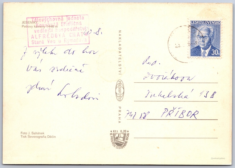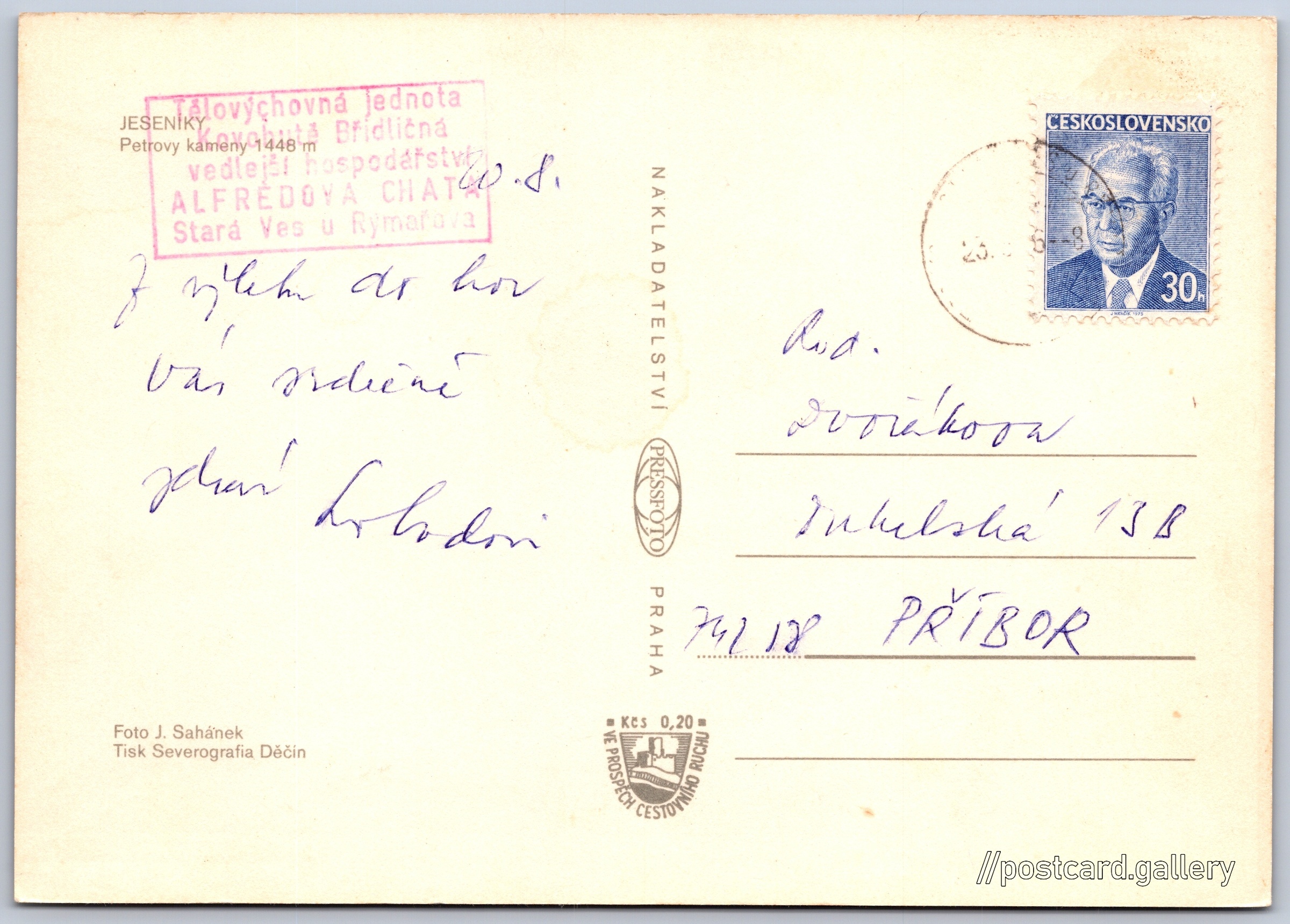 Jeseníky, Petrovy kameny Pokud chcete vidět pohlednice ve vyšším rozlišení nebo zobrazovat jejich zadní stranu, tak se prosím nejdříve přihlašte Přihlásit Zaregistrovat JESENÍKYPetrovy kameny 1448 m Jazyk tištěného textu na pohlednici: čeština Petrovy kameny, Skalní útvar, Malá Morávka, Česko ukázat na mapě V blízkém okolí místa zobrazeného na pohlednici lze najít 26 jiných pohlednic. Zobrazit blízké pohlednice Vydavatel: PressFoto Praha (Československo) Datum vydání není známo Pomozte nám odhadnout datum vzniku pohlednice Velikost (š x v) a tvar pohlednice: 148 x 105 mm (5.83" x 4.13"), obdélník Osoby spjaté s touto pohlednicí: Jaromír Sahánek(Autor fotografie) Prošlá poštou Ceny: Příplatek na tur. ruch: 0,20 Kčs (CSK))Vyplacené známky: 0,30 Kčs (CSK) DiskuseVložit příspěvek Přidat novou složku ... Spravovat složky ...