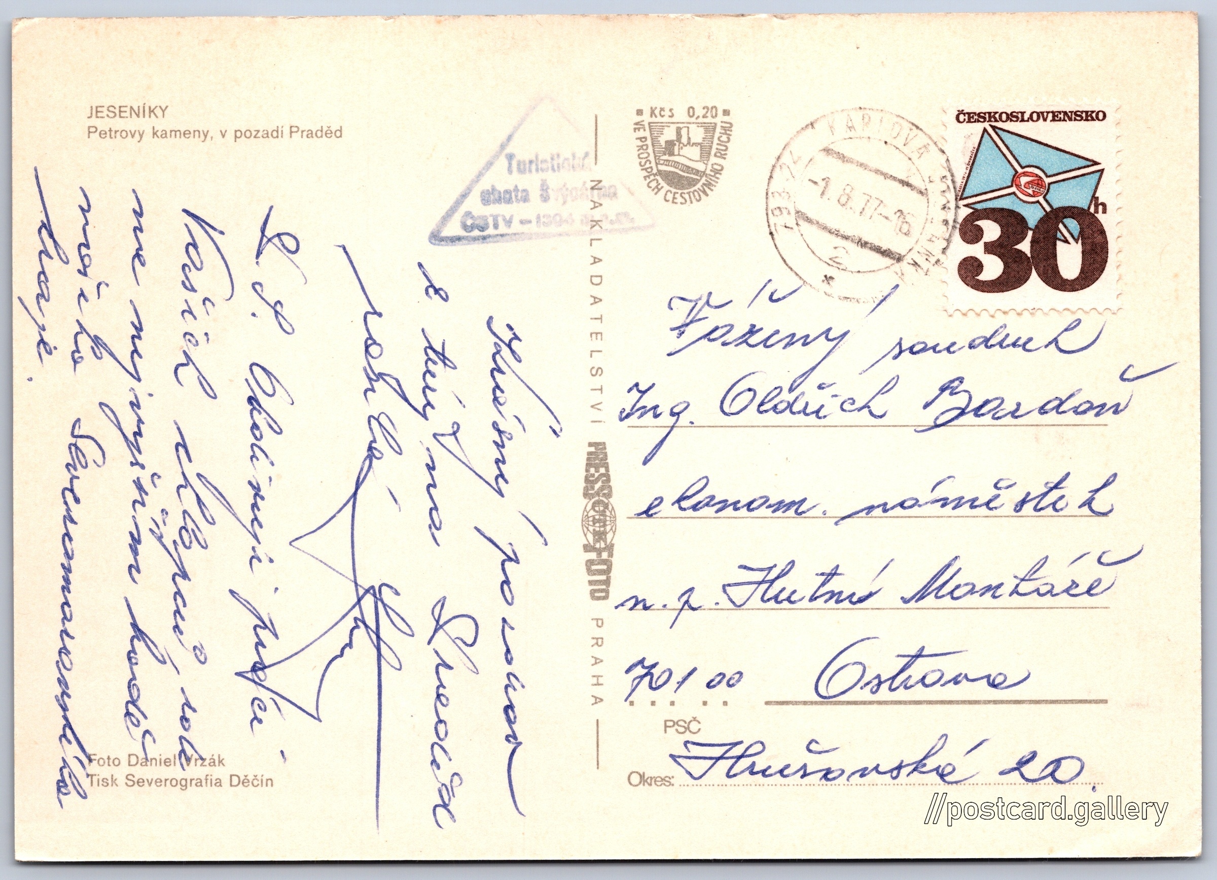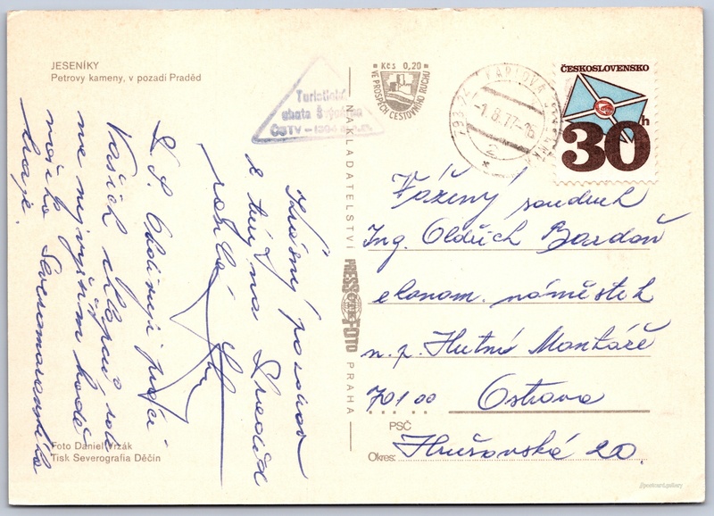 Jeseníky, Petrovy kameny Pokud chcete vidět pohlednice ve vyšším rozlišení nebo zobrazovat jejich zadní stranu, tak se prosím nejdříve přihlašte Přihlásit Zaregistrovat JESENÍKYPetrovy kameny, v pozadí Praděd Jazyk tištěného textu na pohlednici: čeština Petrovy kameny, Skalní útvar, Malá Morávka, Česko ukázat na mapě V blízkém okolí místa zobrazeného na pohlednici lze najít 26 jiných pohlednic. Zobrazit blízké pohlednice Vydavatel: PressFoto Praha (Československo) Odhadované datum vydání pohlednice: 1974 - 1977 Pomozte nám zpřesnit rok vzniku pohlednice Velikost (š x v) a tvar pohlednice: 148 x 105 mm (5.83" x 4.13"), obdélník Osoby spjaté s touto pohlednicí: Daniel Vrzák(Autor fotografie) Prošlá poštou:Datum na razítku: 1.8.1977 Ceny: Příplatek na tur. ruch: 0,20 Kčs (CSK))Vyplacené známky: 0,30 Kčs (CSK) DiskuseVložit příspěvek Přidat novou složku ... Spravovat složky ...