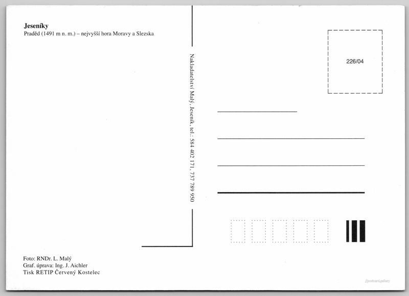 Jeseníky, Praděd Pokud chcete vidět pohlednice ve vyšším rozlišení nebo zobrazovat jejich zadní stranu, tak se prosím nejdříve přihlašte Přihlásit Zaregistrovat Jeseníky JeseníkyPraděd (1491 m n. m.) – nejvyšší hora Moravy a Slezska Jazyk tištěného textu na pohlednici: čeština Rozhledna Praděd, Rozhledna, Malá Morávka ev. č. 38, Malá Morávka, Česko ukázat na mapě Vydavatel: Nakladatelství Malý (Česko) Rok vydání pohlednice: 2004 Velikost (š x v) a tvar pohlednice: 147 x 105 mm (5.79" x 4.13"), obdélník Osoby spjaté s touto pohlednicí: RNDr. L. Malý(Autor fotografie) Ing. J. Aichler(Design pohlednice) Čistá pohlednice (neprošlá poštou) Kódy na pohlednici: 226/04 DiskuseVložit příspěvek Přidat novou složku ... Spravovat složky ...