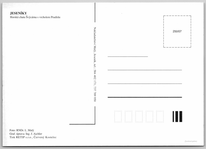 Jeseníky, Švýcárna 5/6 Pokud chcete vidět pohlednice ve vyšším rozlišení nebo zobrazovat jejich zadní stranu, tak se prosím nejdříve přihlašte Přihlásit Zaregistrovat JeseníkyŠvýcárna JESENÍKYHorská chata Švýcárna s vrcholem Pradědu Jazyk tištěného textu na pohlednici: čeština Chata Švýcárna, Historická budova, Kouty nad Desnou 74, Loučná nad Desnou - Kouty nad Desnou, Česko ukázat na mapě Vydavatel: Nakladatelství Malý (Česko) Rok vydání pohlednice: 2007 Velikost (š x v) a tvar pohlednice: 148 x 104 mm (5.83" x 4.09"), obdélník Osoby spjaté s touto pohlednicí: RNDr. L. Malý(Autor fotografie) Ing. J. Aichler(Design pohlednice) Čistá pohlednice (neprošlá poštou) Kódy na pohlednici: 250/07 DiskuseVložit příspěvek Přidat novou složku ... Spravovat složky ...
