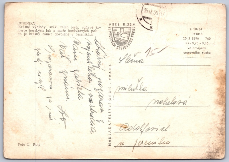 Jeseníky Pokud chcete vidět pohlednice ve vyšším rozlišení nebo zobrazovat jejich zadní stranu, tak se prosím nejdříve přihlašte Přihlásit Zaregistrovat JESENÍKYKrásné výhledy, svěží zeleň lesů, voňavé koberce horských luk a moře borůvkových polí to je krásný rámec dovolené v Jeseníkách Jazyk tištěného textu na pohlednici: čeština Hrubý Jeseník, Pohoří, Česko ukázat na mapě Přesné místo není známo. Pokud jej znáte, tak jej prosím napište do komentářů nebo označte na mapě Vydavatel: Nakladatelství Orbis (Československo) Rok vydání pohlednice: červenec, 1960 Velikost (š x v) a tvar pohlednice: 146 x 103 mm (5.75" x 4.06"), obdélník Osoby spjaté s touto pohlednicí: Lumír Rott(Autor fotografie) Prošlá poštou:Datum na razítku: 15.9.1960 Ceny: Cena pohlednice: 0,70 Kčs (CSK) (+0,20 Kčs přípl. na tur. ruch) Kódy na pohlednici: F 18264 044018 20 3 8596 760 DiskuseVložit příspěvek Přidat novou složku ... Spravovat složky ...