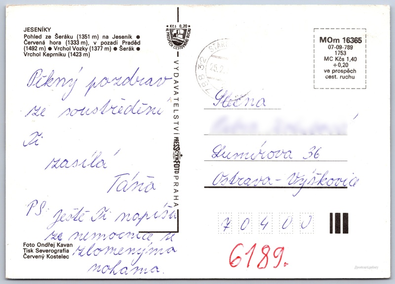 Jeseníky 6/21 Pokud chcete vidět pohlednice ve vyšším rozlišení nebo zobrazovat jejich zadní stranu, tak se prosím nejdříve přihlašte Přihlásit Zaregistrovat Jeseníky JESENÍKY- Pohled ze Šeráku (1351 m) na Jeseník- Červená hora (1333 m), v pozadí Praděd (1492 m)- Vrchol Vozky (1377 m)- Šerák- Vrchol Keprníku (1423 m) Jazyk tištěného textu na pohlednici: čeština Keprník (1423 m), Hora, výškový bod, Ostružná, Česko ukázat na mapě Vydavatel: PressFoto Praha (Československo) Rok vydání pohlednice: 1987 Velikost (š x v) a tvar pohlednice: 148 x 105 mm (5.83" x 4.13"), obdélník Osoby spjaté s touto pohlednicí: Ondřej Kavan(Autor fotografie) Prošlá poštou Ceny: Cena pohlednice: 1,40 Kčs (CSK) (+0,20 Kčs přípl. na tur. ruch) Kódy na pohlednici: MOm 16365 07-09-789 1753 DiskuseVložit příspěvek Přidat novou složku ... Spravovat složky ...