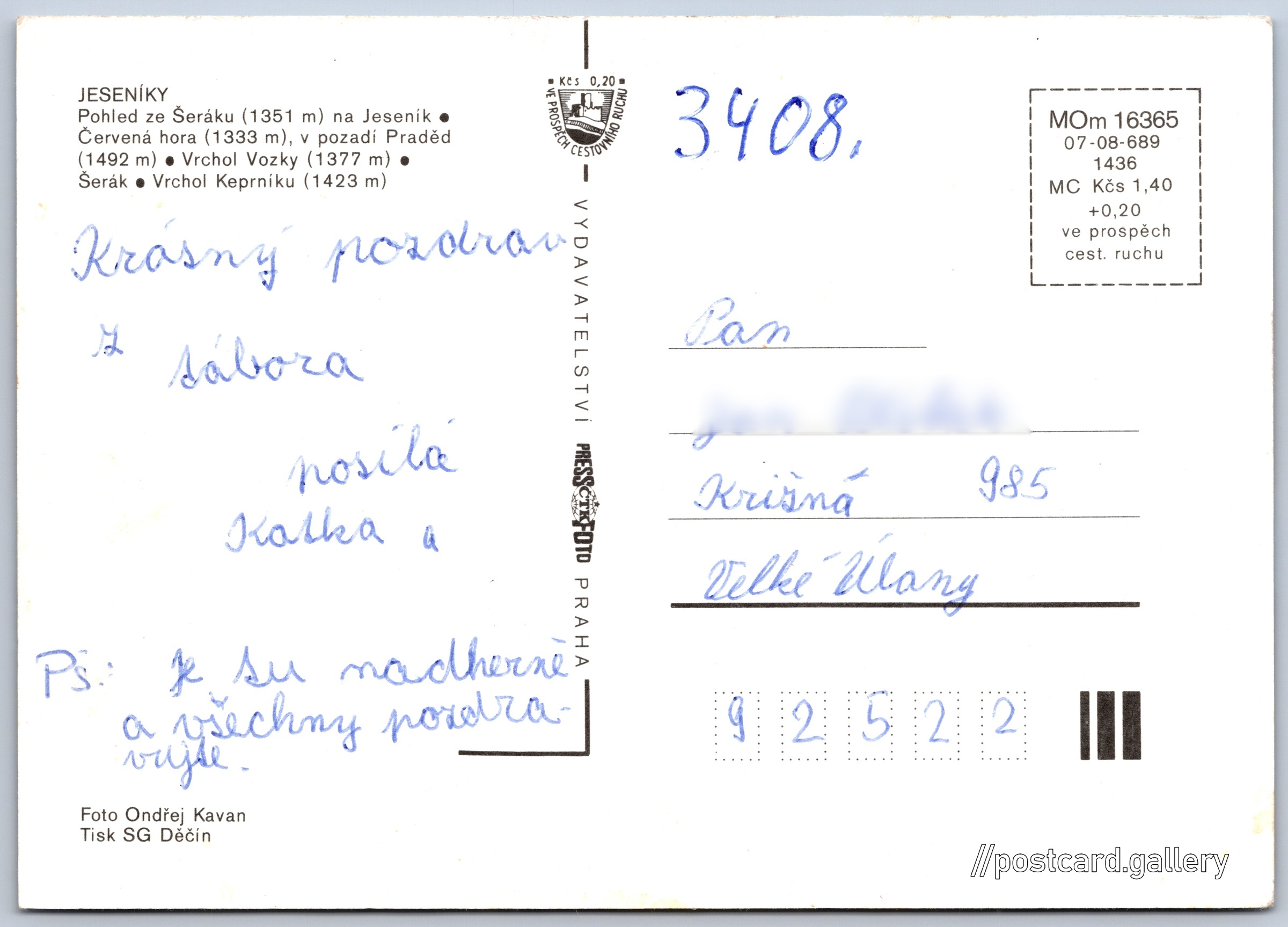 Jeseníky Pokud chcete vidět pohlednice ve vyšším rozlišení nebo zobrazovat jejich zadní stranu, tak se prosím nejdříve přihlašte Přihlásit Zaregistrovat Chráněná krajinná oblastJeseníky JESENÍKY- Pohled ze Šeráku (1351 m) na Jeseník- Červená hora (1333 m), v pozadí Praděd (1492 m)- Vrchol Vozky (1377 m)- Šerák- Vrchol Keprníku (1423 m) Jazyk tištěného textu na pohlednici: čeština Keprník (1423 m), Hora, výškový bod, Ostružná, Česko ukázat na mapě Vydavatel: PressFoto Praha (Československo) Rok vydání pohlednice: 1986 Velikost (š x v) a tvar pohlednice: 148 x 105 mm (5.83" x 4.13"), obdélník Osoby spjaté s touto pohlednicí: Ondřej Kavan(Autor fotografie) Prošlá poštou Ceny: Cena pohlednice: 1,40 Kčs (CSK) (+0,20 Kčs přípl. na tur. ruch) Kódy na pohlednici: MOm 16365 07-08-689 1436 DiskuseVložit příspěvek Přidat novou složku ... Spravovat složky ...