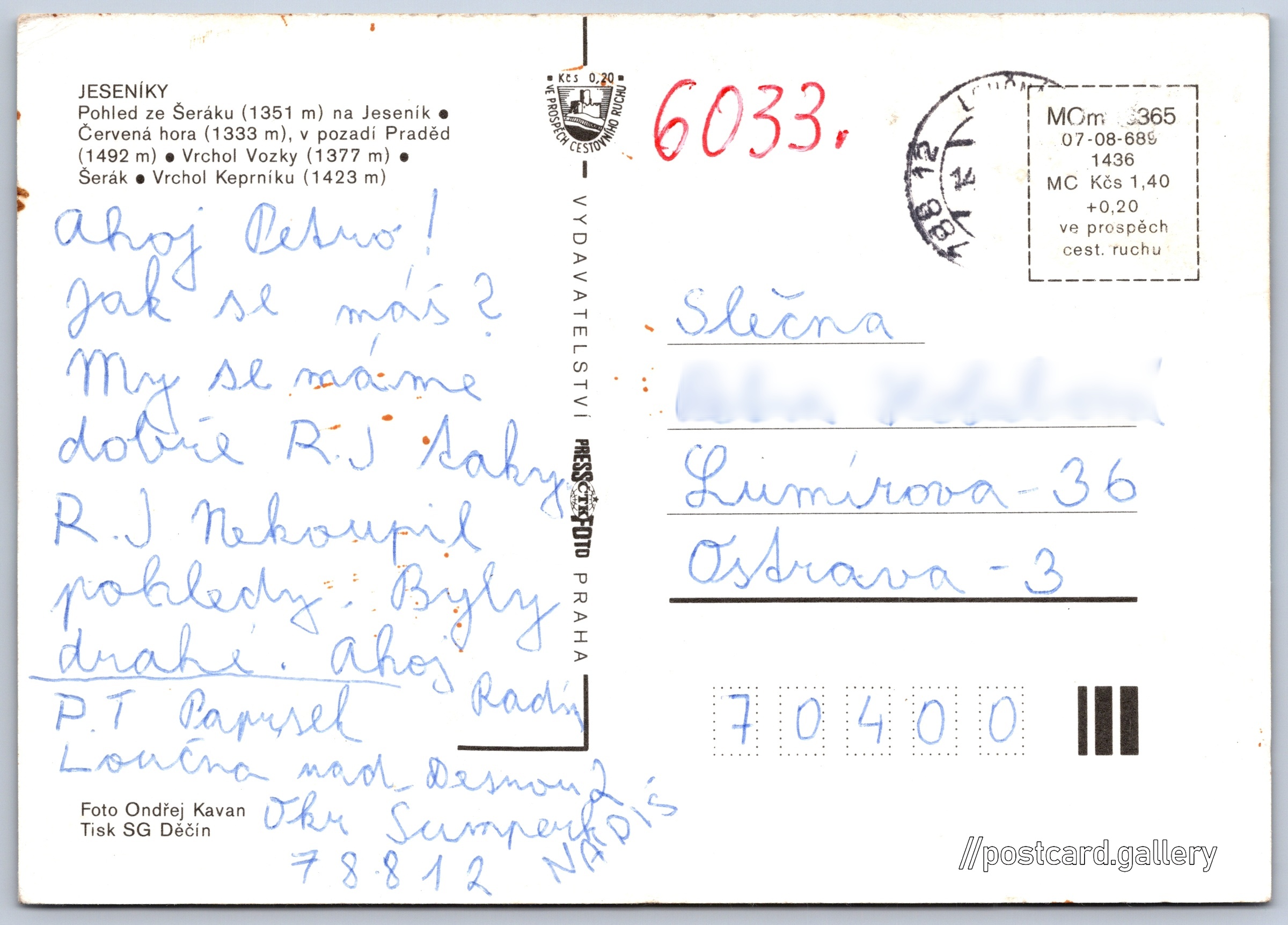 Jeseníky Pokud chcete vidět pohlednice ve vyšším rozlišení nebo zobrazovat jejich zadní stranu, tak se prosím nejdříve přihlašte Přihlásit Zaregistrovat Chráněná krajinná oblastJeseníky JESENÍKY- Pohled ze Šeráku (1351 m) na Jeseník- Červená hora (1333 m), v pozadí Praděd (1492 m)- Vrchol Vozky (1377 m)- Šerák- Vrchol Keprníku (1423 m) Jazyk tištěného textu na pohlednici: čeština Keprník (1423 m), Hora, výškový bod, Ostružná, Česko ukázat na mapě Vydavatel: PressFoto Praha (Československo) Rok vydání pohlednice: 1986 Velikost (š x v) a tvar pohlednice: 148 x 105 mm (5.83" x 4.13"), obdélník Osoby spjaté s touto pohlednicí: Ondřej Kavan(Autor fotografie) Prošlá poštou Ceny: Cena pohlednice: 1,40 Kčs (CSK) (+0,20 Kčs přípl. na tur. ruch) Kódy na pohlednici: MOm 16365 07-08-689 1436 DiskuseVložit příspěvek Přidat novou složku ... Spravovat složky ...