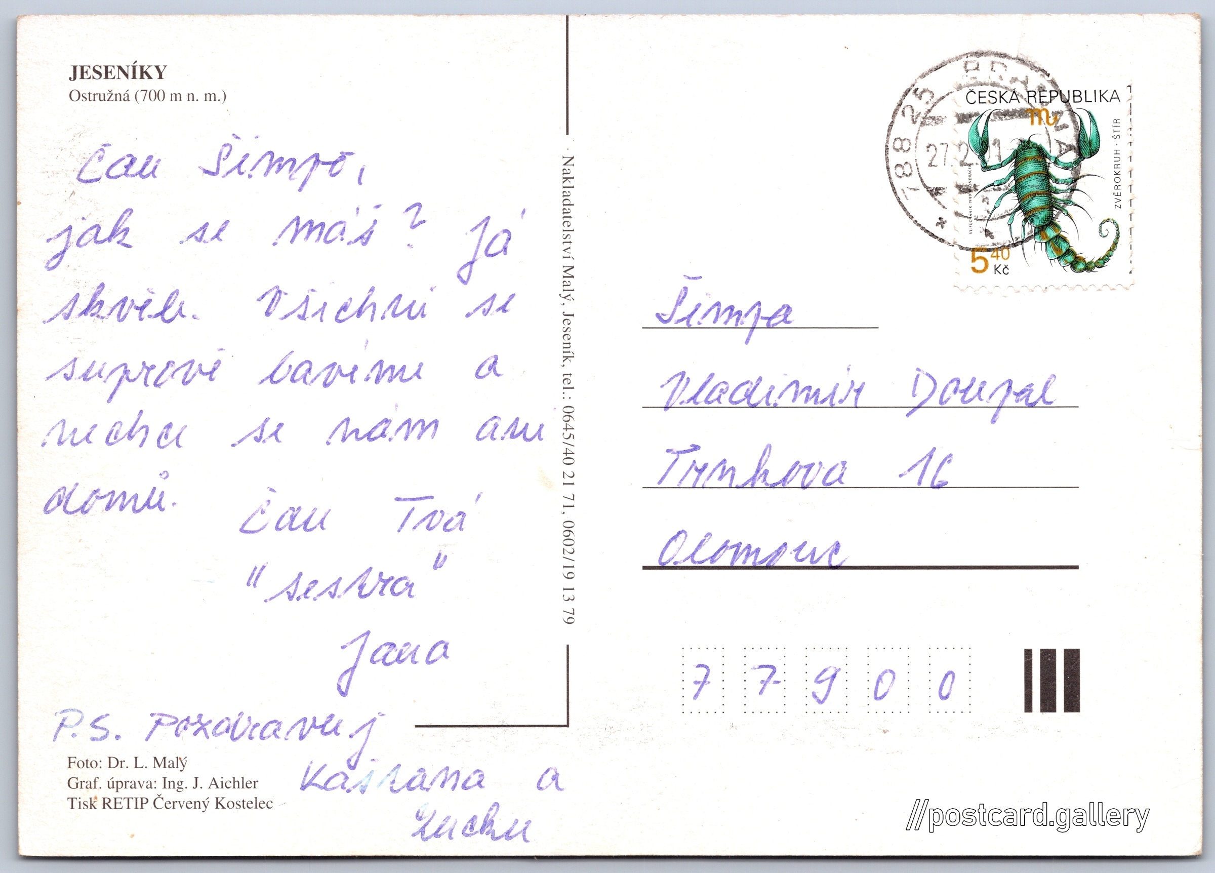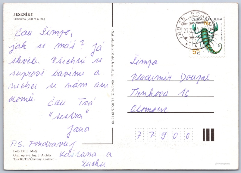 Jesníky, Ostružná Pokud chcete vidět pohlednice ve vyšším rozlišení nebo zobrazovat jejich zadní stranu, tak se prosím nejdříve přihlašte Přihlásit Zaregistrovat Ostružná JESENÍKYOstružná (700 m n. m.) Jazyk tištěného textu na pohlednici: čeština Ostružná, Obec, Česko ukázat na mapě V blízkém okolí místa zobrazeného na pohlednici lze najít 9 jiných pohlednic. Zobrazit blízké pohlednice Vydavatel: Nakladatelství Malý (Česko) Odhadované datum vydání pohlednice: 1998 - 2001 Pomozte nám zpřesnit rok vzniku pohlednice Velikost (š x v) a tvar pohlednice: 148 x 105 mm (5.83" x 4.13"), obdélník Osoby spjaté s touto pohlednicí: Ing. J. Aichler(Design pohlednice) RNDr. L. Malý(Autor fotografie) Prošlá poštou:Datum na razítku: 27.2.2001 Ceny: Vyplacené známky: 5,40 Kč (CZK) DiskuseVložit příspěvek Přidat novou složku ... Spravovat složky ...