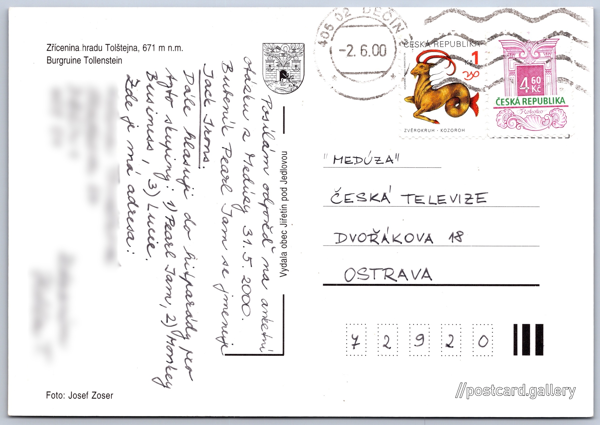 Jiřetín pod Jedlovou 4/4 Pokud chcete vidět pohlednice ve vyšším rozlišení nebo zobrazovat jejich zadní stranu, tak se prosím nejdříve přihlašte Přihlásit Zaregistrovat Jiřetín pod Jedlovou Zřícenina.hradu Tolštejna, 671 m n.m.Burgruine Tollenstein Jazyky tištěného textu na pohlednici: čeština, němčina Zřícenina hradu Tolštejn, Zřícenina, Rozhled 79, Jiřetín pod Jedlovou - Rozhled, Česko ukázat na mapě V blízkém okolí místa zobrazeného na pohlednici lze najít 1 jinou pohlednici. Zobrazit blízké pohlednice Odhadované datum vydání pohlednice: 1997 - 2000 Pomozte nám zpřesnit rok vzniku pohlednice Velikost (š x v) a tvar pohlednice: 149 x 104 mm (5.87" x 4.09"), obdélník Osoby spjaté s touto pohlednicí: Josef Zoser(Autor fotografie) Prošlá poštou:Datum na razítku: 2.6.2000 Ceny: Vyplacené známky: 5,60 Kč (CZK) DiskuseVložit příspěvek Přidat novou složku ... Spravovat složky ...