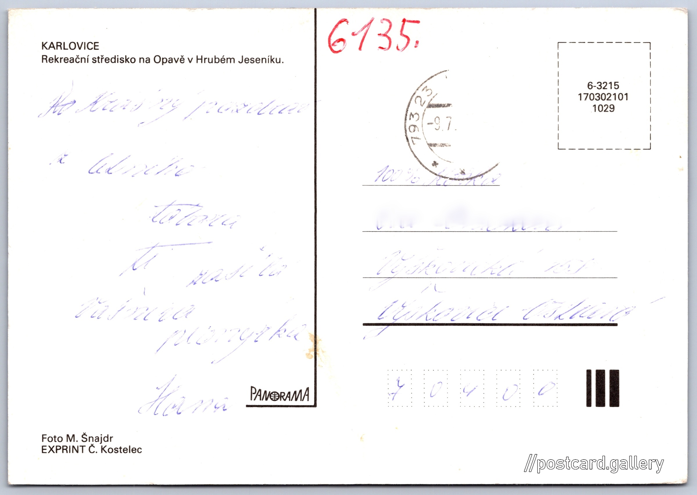 Karlovice Pokud chcete vidět pohlednice ve vyšším rozlišení nebo zobrazovat jejich zadní stranu, tak se prosím nejdříve přihlašte Přihlásit Zaregistrovat Karlovice KARLOVICERekreační středisko na Opavě v Hrubém Jeseníku. Jazyk tištěného textu na pohlednici: čeština Karlovice 183, Karlovice, 793 23, Bruntál ukázat na mapě Přesné místo není známo. Pokud jej znáte, tak jej prosím napište do komentářů nebo označte na mapě Vydavatel: Panorama (Československo) Datum vydání není známo Pomozte nám odhadnout datum vzniku pohlednice Velikost (š x v) a tvar pohlednice: 147 x 102 mm (5.79" x 4.02"), obdélník Osoby spjaté s touto pohlednicí: M. Šnajdr(Autor fotografie) Prošlá poštou Kódy na pohlednici: 6-3215 170302101 1029 DiskuseVložit příspěvek Přidat novou složku ... Spravovat složky ...