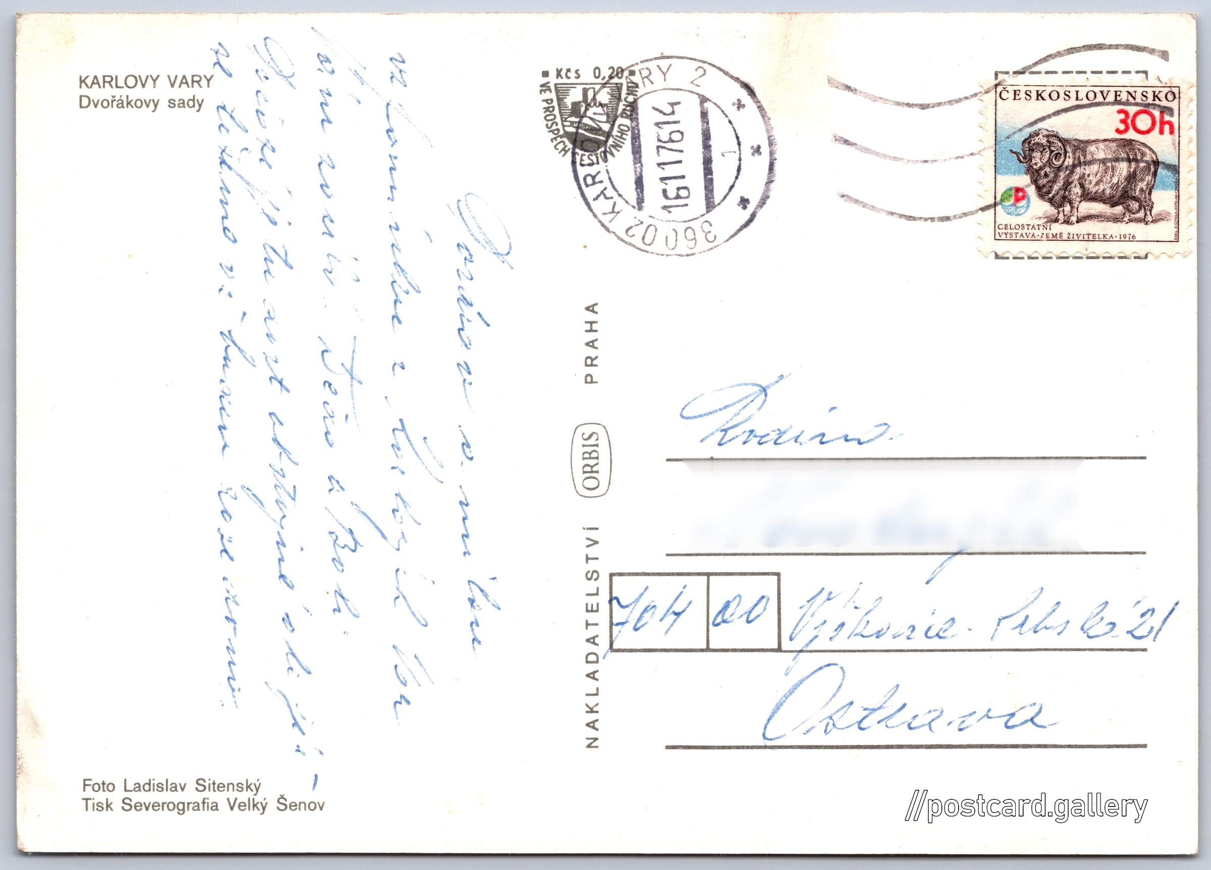 Karlovy Vary, Dvořákovy sady Pokud chcete vidět pohlednice ve vyšším rozlišení nebo zobrazovat jejich zadní stranu, tak se prosím nejdříve přihlašte Přihlásit Zaregistrovat Karlovy Vary KARLOVY VARYDvořákovy sady Jazyk tištěného textu na pohlednici: čeština Karlovy Vary, Karlovy Vary ukázat na mapě V blízkém okolí místa zobrazeného na pohlednici lze najít 62 jiných pohlednic. Zobrazit blízké pohlednice Vydavatel: Nakladatelství Orbis (Československo) Odhadované datum vydání pohlednice: 1973 - 1976 Pomozte nám zpřesnit rok vzniku pohlednice Velikost (š x v) a tvar pohlednice: 146 x 104 mm (5.75" x 4.09"), obdélník Osoby spjaté s touto pohlednicí: Ladislav Sitenský(Autor fotografie) Prošlá poštou:Datum na razítku: 16.11.1976 Ceny: Příplatek na tur. ruch: 0,20 Kčs (CSK))Vyplacené známky: 0,30 Kčs (CSK) DiskuseVložit příspěvek Přidat novou složku ... Spravovat složky ...