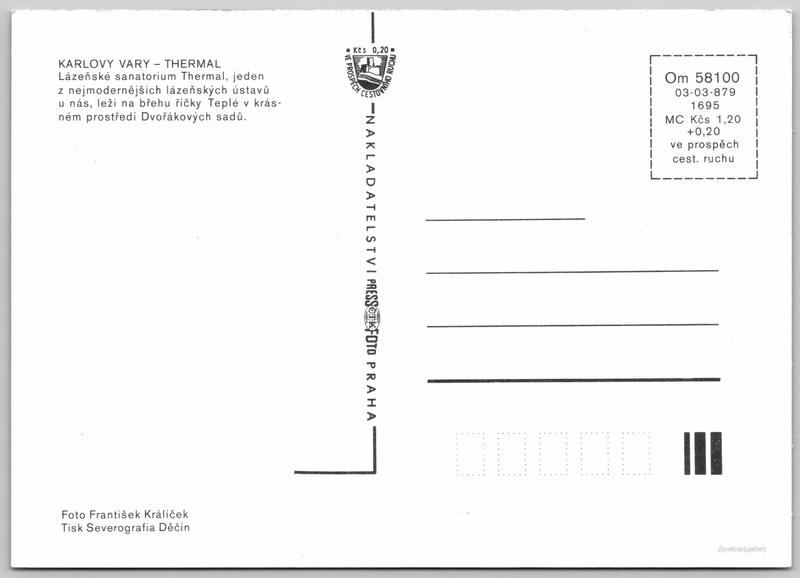Karlovy Vary, hotel Thermal Pokud chcete vidět pohlednice ve vyšším rozlišení nebo zobrazovat jejich zadní stranu, tak se prosím nejdříve přihlašte Přihlásit Zaregistrovat ThermalKarlovy Vary KARLOVY VARY – THERMALLázeňské sanatorium Thermal, jeden z nejmodernějších lázeňských ústavů u nás, leží na břehu říčky Teplé v krásném prostředí Dvořákových sadů. Jazyk tištěného textu na pohlednici: čeština HOTEL THERMAL****, I. P. Pavlova 2001/11, Karlovy Vary, Česko ukázat na mapě V blízkém okolí místa zobrazeného na pohlednici lze najít 62 jiných pohlednic. Zobrazit blízké pohlednice Vydavatel: PressFoto Praha (Československo) Rok vydání pohlednice: 1978 Velikost (š x v) a tvar pohlednice: 146 x 106 mm (5.75" x 4.17"), obdélník Osoby spjaté s touto pohlednicí: František Králíček(Autor fotografie) Čistá pohlednice (neprošlá poštou) Ceny: Cena pohlednice: 1,20 Kčs (CSK) (+0,20 Kčs přípl. na tur. ruch) Kódy na pohlednici: Om 58100 03-03-879 1695 DiskuseVložit příspěvek Přidat novou složku ... Spravovat složky ...