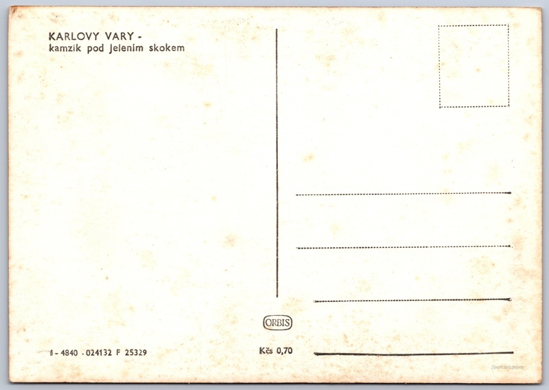 Karlovy Vary, kamzík pod Jelením skokem Pokud chcete vidět pohlednice ve vyšším rozlišení nebo zobrazovat jejich zadní stranu, tak se prosím nejdříve přihlašte Přihlásit Zaregistrovat KARLOVY VARY -kamzík pod Jelením skokem Jazyk tištěného textu na pohlednici: čeština Skála Kamzík, Skalní útvar, Karlovy Vary, Česko ukázat na mapě V blízkém okolí místa zobrazeného na pohlednici lze najít 62 jiných pohlednic. Zobrazit blízké pohlednice Vydavatel: Nakladatelství Orbis (Československo) Datum vydání není známo Pomozte nám odhadnout datum vzniku pohlednice Velikost (š x v) a tvar pohlednice: 145 x 102 mm (5.71" x 4.02"), obdélník Čistá pohlednice (neprošlá poštou) Ceny: Cena pohlednice: 0,70 Kčs (CSK) Kódy na pohlednici: 1-4840-024132 F 25329 DiskuseVložit příspěvek Přidat novou složku ... Spravovat složky ...