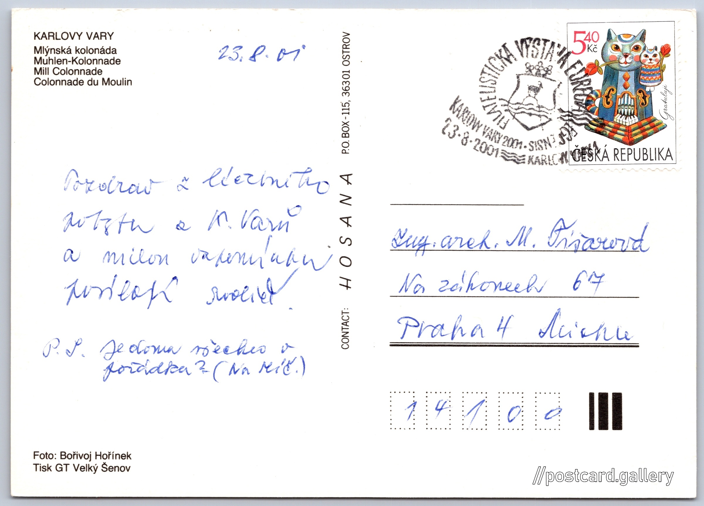 Karlovy Vary, Mlýnská kolonáda Pokud chcete vidět pohlednice ve vyšším rozlišení nebo zobrazovat jejich zadní stranu, tak se prosím nejdříve přihlašte Přihlásit Zaregistrovat KARLOVY VARY- Mlýnská kolonáda- Muhlen-Kolonnade- Mill Colonnade- Colonnade du Moulin Jazyky tištěného textu na pohlednici: čeština, němčina, angličtina, francouzština Lázeňská, Karlovy Vary, Karlovy Vary ukázat na mapě V blízkém okolí místa zobrazeného na pohlednici lze najít 62 jiných pohlednic. Zobrazit blízké pohlednice Vydavatel: Hosana (Česko) Odhadované datum vydání pohlednice: 1998 - 2001 Pomozte nám zpřesnit rok vzniku pohlednice Velikost (š x v) a tvar pohlednice: 147 x 105 mm (5.79" x 4.13"), obdélník Osoby spjaté s touto pohlednicí: Bořivoj Hořínek(Autor fotografie) Prošlá poštou:Datum na razítku: 23.8.2001Datum napsání pohledu: 23.8.2001 Ceny: Vyplacené známky: 5,40 Kč (CZK) DiskuseVložit příspěvek Přidat novou složku ... Spravovat složky ...