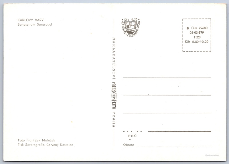 Karlovy Vary, sanatorium Sanssouci Pokud chcete vidět pohlednice ve vyšším rozlišení nebo zobrazovat jejich zadní stranu, tak se prosím nejdříve přihlašte Přihlásit Zaregistrovat KARLOVY VARYSanatoirum Sanssouci Jazyk tištěného textu na pohlednici: čeština Lázeňský hotel Sanssouci, Současná architektura, Karlovy Vary, Česko ukázat na mapě V blízkém okolí místa zobrazeného na pohlednici lze najít 62 jiných pohlednic. Zobrazit blízké pohlednice Vydavatel: PressFoto Praha (Československo) Rok vydání pohlednice: 1978 Velikost (š x v) a tvar pohlednice: 148 x 105 mm (5.83" x 4.13"), obdélník Osoby spjaté s touto pohlednicí: František Maleček(Autor fotografie) Čistá pohlednice (neprošlá poštou) Ceny: Cena pohlednice: 0,80 Kčs (CSK) (+0,20 Kčs přípl. na tur. ruch) Kódy na pohlednici: •Om 29680 03-03-879 1520 DiskuseVložit příspěvek Přidat novou složku ... Spravovat složky ...