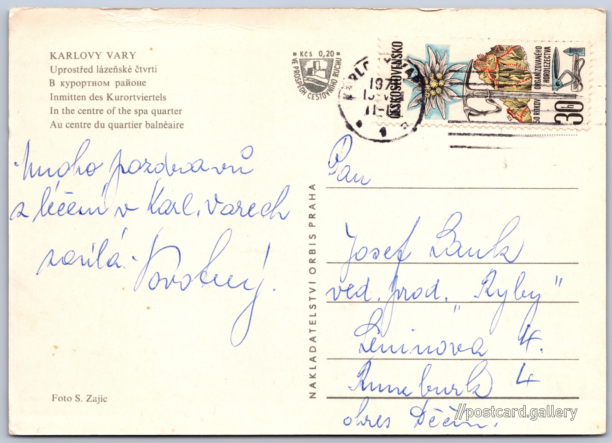 Karlovy Vary, uprostřed lázeňské čtvrti Pokud chcete vidět pohlednice ve vyšším rozlišení nebo zobrazovat jejich zadní stranu, tak se prosím nejdříve přihlašte Přihlásit Zaregistrovat KARLOVY VARY- Uprostřed lázeňské čtvrti- В курортном районе- Inmitten des Kurortviertels- In the centre of the spa quarter- Au centre du quartier balnéaire Jazyk tištěného textu na pohlednici: čeština Vřídelní, Karlovy Vary, Karlovy Vary ukázat na mapě V blízkém okolí místa zobrazeného na pohlednici lze najít 62 jiných pohlednic. Zobrazit blízké pohlednice Vydavatel: Nakladatelství Orbis (Československo) Odhadované datum vydání pohlednice: 1968 - 1971 Pomozte nám zpřesnit rok vzniku pohlednice Velikost (š x v) a tvar pohlednice: 148 x 106 mm (5.83" x 4.17"), obdélník Osoby spjaté s touto pohlednicí: Stanislav Zajic(Autor fotografie) Prošlá poštou:Datum na razítku: 13.8.1971 Ceny: Příplatek na tur. ruch: 0,20 Kčs (CSK))Vyplacené známky: 0,30 Kčs (CSK) DiskuseVložit příspěvek Přidat novou složku ... Spravovat složky ...
