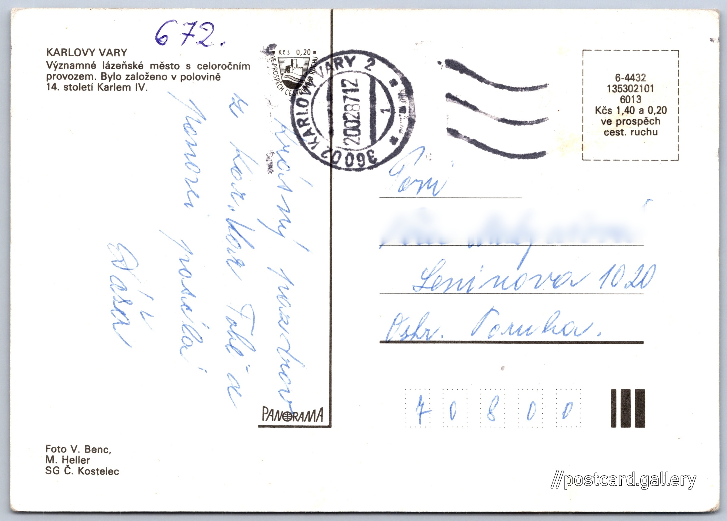 Karlovy Vary Pokud chcete vidět pohlednice ve vyšším rozlišení nebo zobrazovat jejich zadní stranu, tak se prosím nejdříve přihlašte Přihlásit Zaregistrovat Karlovy Vary KARLOVY VARYVýznamné lázeňské město s celoročním provozem. Bylo založeno v polovině 14. století Karlem IV. Jazyk tištěného textu na pohlednici: čeština Krále Jiřího 1040/2c, Karlovy Vary, 360 01, Karlovy Vary ukázat na mapě Vydavatel: Panorama (Československo) Odhadované datum vydání pohlednice: 1984 - 1987 Pomozte nám zpřesnit rok vzniku pohlednice Velikost (š x v) a tvar pohlednice: 147 x 105 mm (5.79" x 4.13"), obdélník Osoby spjaté s touto pohlednicí: M. Heller(Autor fotografie) Vratislav Benc(Autor fotografie) Prošlá poštou:Datum na razítku: 20.2.1987 Ceny: Cena pohlednice: 1,40 Kčs (CSK) (+0,20 Kčs přípl. na tur. ruch) Kódy na pohlednici: 6-4432 135302101 6013 DiskuseVložit příspěvek Přidat novou složku ... Spravovat složky ...