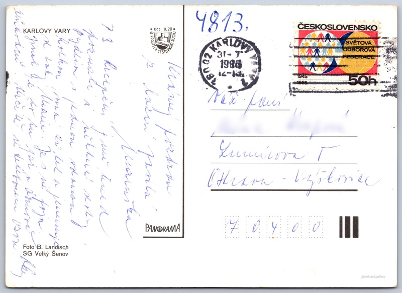 Karlovy Vary Pokud chcete vidět pohlednice ve vyšším rozlišení nebo zobrazovat jejich zadní stranu, tak se prosím nejdříve přihlašte Přihlásit Zaregistrovat Karlovy Vary KARLOVY VARY Jazyk tištěného textu na pohlednici: čeština Karlovy Vary, Karlovy Vary ukázat na mapě Vydavatel: Panorama (Československo) Odhadované datum vydání pohlednice: 1983 - 1986 Pomozte nám zpřesnit rok vzniku pohlednice Velikost (š x v) a tvar pohlednice: 147 x 106 mm (5.79" x 4.17"), obdélník Osoby spjaté s touto pohlednicí: Bohumil Landisch(Autor fotografie) Prošlá poštou:Datum na razítku: 31.7.1986 Ceny: Příplatek na tur. ruch: 0,20 Kčs (CSK))Vyplacené známky: 0,50 Kčs (CSK) DiskuseVložit příspěvek Přidat novou složku ... Spravovat složky ...