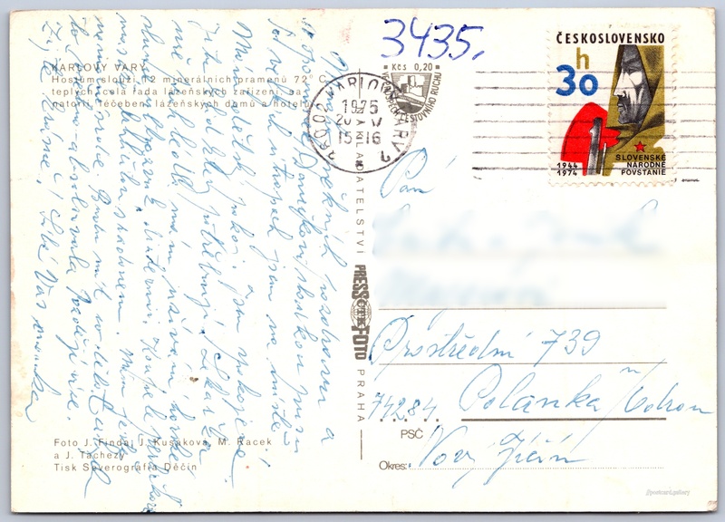 Karlovy Vary 7/8 Pokud chcete vidět pohlednice ve vyšším rozlišení nebo zobrazovat jejich zadní stranu, tak se prosím nejdříve přihlašte Přihlásit Zaregistrovat Karlovy Vary KARLOVY VARYHostům slouží 12 minerálních pramenů 72° teplých, celá řada lázeňských zařízení, sanatorií, léčeben, lázeňských domů a hotelů. Jazyk tištěného textu na pohlednici: čeština Karlovy Vary, Karlovy Vary ukázat na mapě Vydavatel: PressFoto Praha (Československo) Odhadované datum vydání pohlednice: 1972 - 1975 Pomozte nám zpřesnit rok vzniku pohlednice Velikost (š x v) a tvar pohlednice: 147 x 105 mm (5.79" x 4.13"), obdélník Osoby spjaté s touto pohlednicí: Jarmila Kusáková(Autor fotografie) Milan Racek(Autor fotografie) Jan Tachezy(Autor fotografie) Jiří Finda(Autor fotografie) Prošlá poštou:Datum na razítku: 20.5.1975 Ceny: Příplatek na tur. ruch: 0,20 Kčs (CSK))Vyplacené známky: 0,30 Kčs (CSK) DiskuseVložit příspěvek Přidat novou složku ... Spravovat složky ...