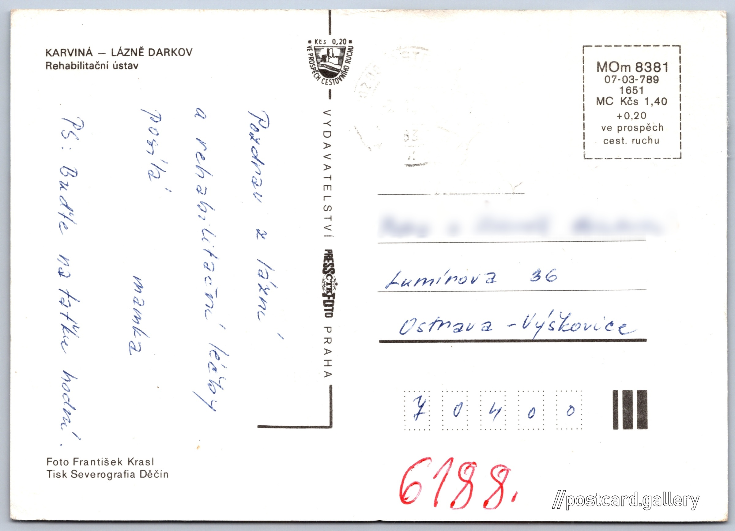 Karviná, Lázně Darkov Pokud chcete vidět pohlednice ve vyšším rozlišení nebo zobrazovat jejich zadní stranu, tak se prosím nejdříve přihlašte Přihlásit Zaregistrovat Lázně Darkov KARVINÁ - LÁZNĚ DARKOVRehabilitační ústav Jazyk tištěného textu na pohlednici: čeština Vydavatel: PressFoto Praha (Československo) Rok vydání pohlednice: 1987 Velikost (š x v) a tvar pohlednice: 148 x 105 mm (5.83" x 4.13"), obdélník Osoby spjaté s touto pohlednicí: František Krasl(Autor fotografie) Prošlá poštou Ceny: Cena pohlednice: 1,40 Kčs (CSK) (+0,20 Kčs přípl. na tur. ruch) Kódy na pohlednici: MOm 8381 07-03-789 1651 DiskuseVložit příspěvek Přidat novou složku ... Spravovat složky ...