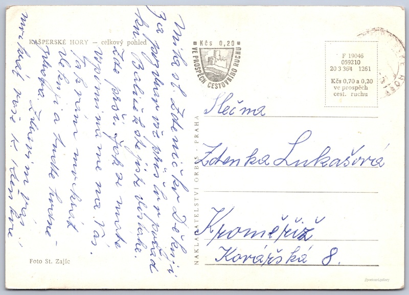 Kašperské Hory, celkový pohled 4/11 Pokud chcete vidět pohlednice ve vyšším rozlišení nebo zobrazovat jejich zadní stranu, tak se prosím nejdříve přihlašte Přihlásit Zaregistrovat KAŠPERSKÉ HORY - celkový pohled Jazyk tištěného textu na pohlednici: čeština Náměstí 143, Kašperské Hory, 341 92, Klatovy ukázat na mapě Vydavatel: Nakladatelství Orbis (Československo) Rok vydání pohlednice: prosinec, 1961 Velikost (š x v) a tvar pohlednice: 144 x 102 mm (5.67" x 4.02"), obdélník Osoby spjaté s touto pohlednicí: Stanislav Zajic(Autor fotografie) Prošlá poštou Ceny: Cena pohlednice: 0,70 Kčs (CSK) (+0,20 Kčs přípl. na tur. ruch) Kódy na pohlednici: F 19046 059210 20 3 364 1261 DiskuseVložit příspěvek Přidat novou složku ... Spravovat složky ...