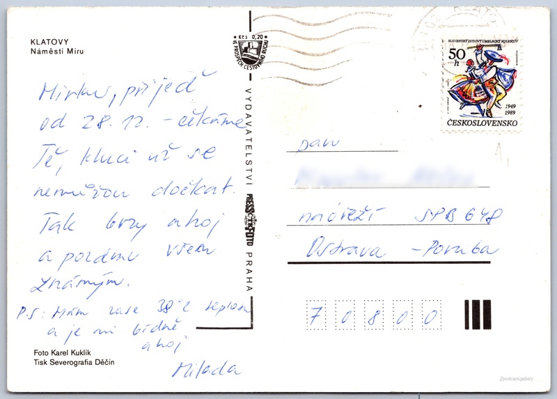 Klatovy, Náměstí míru Pokud chcete vidět pohlednice ve vyšším rozlišení nebo zobrazovat jejich zadní stranu, tak se prosím nejdříve přihlašte Přihlásit Zaregistrovat KLATOVYNáměstí Míru Jazyk tištěného textu na pohlednici: čeština Klatovy I, Klatovy, Klatovy ukázat na mapě V blízkém okolí místa zobrazeného na pohlednici lze najít 3 jiné pohlednice. Zobrazit blízké pohlednice Vydavatel: PressFoto Praha (Československo) Odhadované datum vydání pohlednice: 1986 - 1989 Pomozte nám zpřesnit rok vzniku pohlednice Velikost (š x v) a tvar pohlednice: 148 x 105 mm (5.83" x 4.13"), obdélník Osoby spjaté s touto pohlednicí: Karel Kuklík(Autor fotografie) Prošlá poštou:Datum na razítku: 18.12.1989 Ceny: Příplatek na tur. ruch: 0,20 Kčs (CSK))Vyplacené známky: 0,50 Kčs (CSK) DiskuseVložit příspěvek Přidat novou složku ... Spravovat složky ...