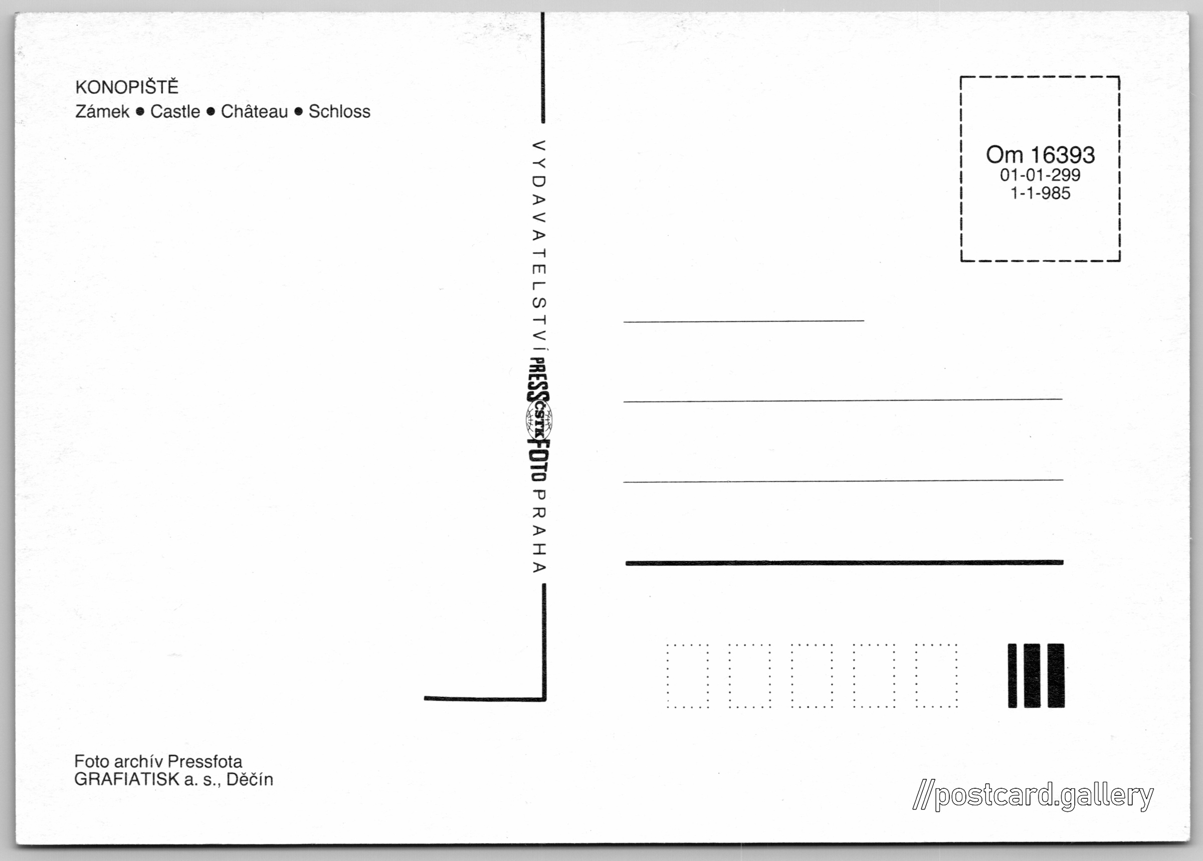 Konopiště, zámek Pokud chcete vidět pohlednice ve vyšším rozlišení nebo zobrazovat jejich zadní stranu, tak se prosím nejdříve přihlašte Přihlásit Zaregistrovat KONOPIŠTĚ- Zámek- Castle- Château- Schloss Jazyky tištěného textu na pohlednici: čeština, angličtina, francouzština, němčina Konopiště, Benešov, Benešov ukázat na mapě V blízkém okolí místa zobrazeného na pohlednici lze najít 7 jiných pohlednic. Zobrazit blízké pohlednice Vydavatel: PressFoto Praha (Československo) Rok vydání pohlednice: 1992 Velikost (š x v) a tvar pohlednice: 148 x 105 mm (5.83" x 4.13"), obdélník Čistá pohlednice (neprošlá poštou) Kódy na pohlednici: Om 16393 01-01-299 1-1-985 DiskuseVložit příspěvek Přidat novou složku ... Spravovat složky ...