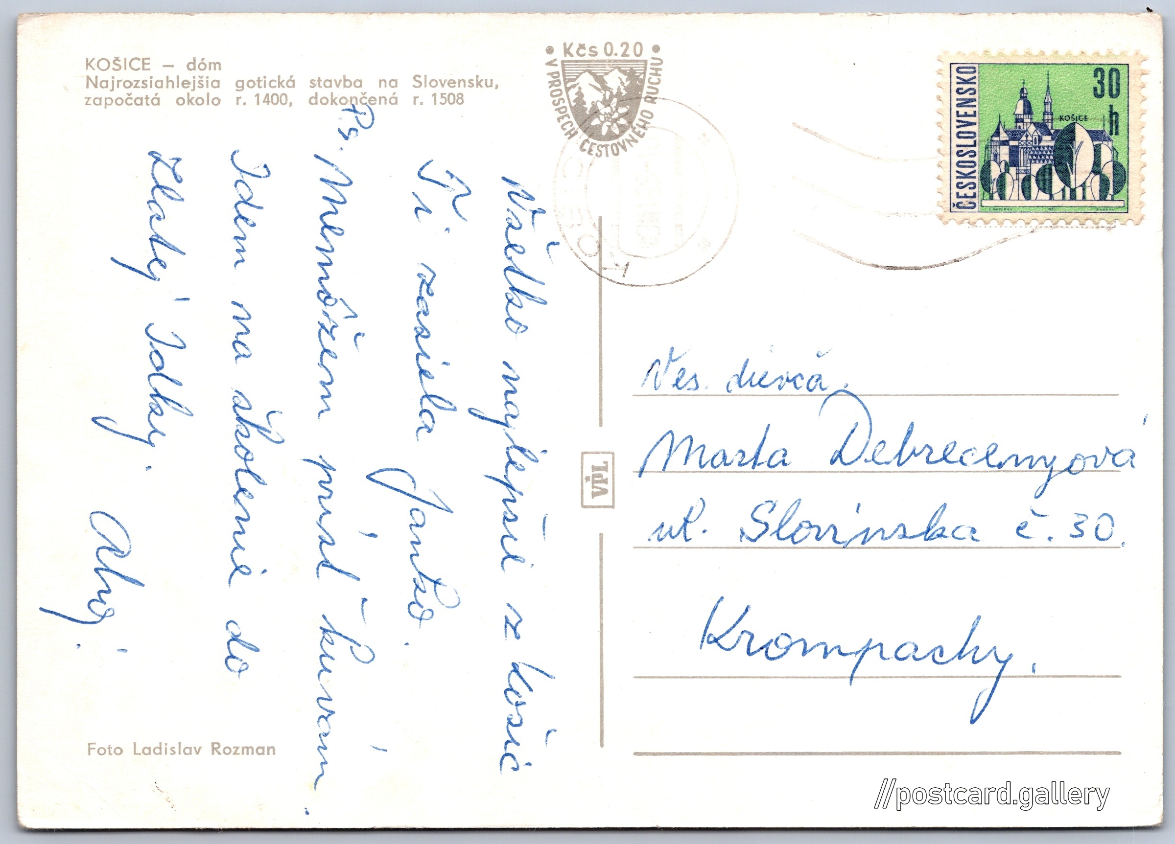 Košice, katedrála svaté Alžběty Pokud chcete vidět pohlednice ve vyšším rozlišení nebo zobrazovat jejich zadní stranu, tak se prosím nejdříve přihlašte Přihlásit Zaregistrovat KOŠICE - dómNajrozsiahlejšia gotická stavba na Slovensku, započatá okolo r. 1400, dokončená r. 1508 Jazyk tištěného textu na pohlednici: slovenština Katedrála svaté Alžběty, Kostel, Hlavné námestie 1/4, Košice, Slovensko ukázat na mapě V blízkém okolí místa zobrazeného na pohlednici lze najít 12 jiných pohlednic. Zobrazit blízké pohlednice Vydavatel: VPL (Československo) Datum vydání není známo Pomozte nám odhadnout datum vzniku pohlednice Velikost (š x v) a tvar pohlednice: 148 x 105 mm (5.83" x 4.13"), obdélník Osoby spjaté s touto pohlednicí: Ladislav Rozman(Autor fotografie) Prošlá poštou Ceny: Příplatek na tur. ruch: 0,20 Kčs (CSK))Vyplacené známky: 0,30 Kčs (CSK) DiskuseVložit příspěvek Přidat novou složku ... Spravovat složky ...