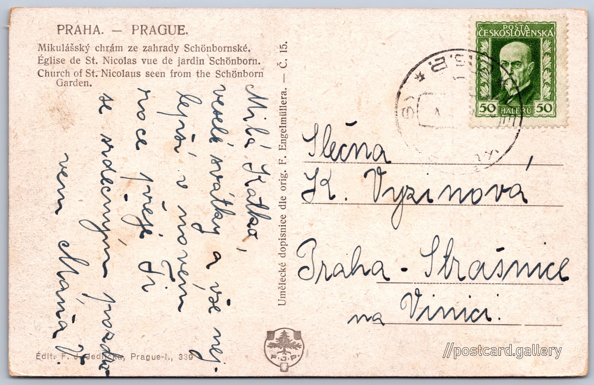 Kostel sv. Mikuláše z Schönbornské zahrady Pokud chcete vidět pohlednice ve vyšším rozlišení nebo zobrazovat jejich zadní stranu, tak se prosím nejdříve přihlašte Přihlásit Zaregistrovat PRAHA. - PRAGUE.Mikulášský chrám ze zahrady Schönbornské.Église de St. Nicolas vue de jardin Schönborn.Church of St. Nicolaus seen from the Schönborn Garden.Umělecké dopisnice dle orig. F. Engelmïllera. č. 15 Jazyky tištěného textu na pohlednici: čeština, angličtina, francouzština Praha 1, Praha, Hlavní město Praha ukázat na mapě V blízkém okolí místa zobrazeného na pohlednici lze najít 159 jiných pohlednic. Zobrazit blízké pohlednice Odhadované datum vydání pohlednice: 1930 - 1935 Pomozte nám zpřesnit rok vzniku pohlednice Velikost (š x v) a tvar pohlednice: 139 x 88 mm (5.47" x 3.46"), obdélník Osoby spjaté s touto pohlednicí: Ferdinand Engelmüller(Autor předlohy) Prošlá poštou DiskuseVložit příspěvek Přidat novou složku ... Spravovat složky ...
