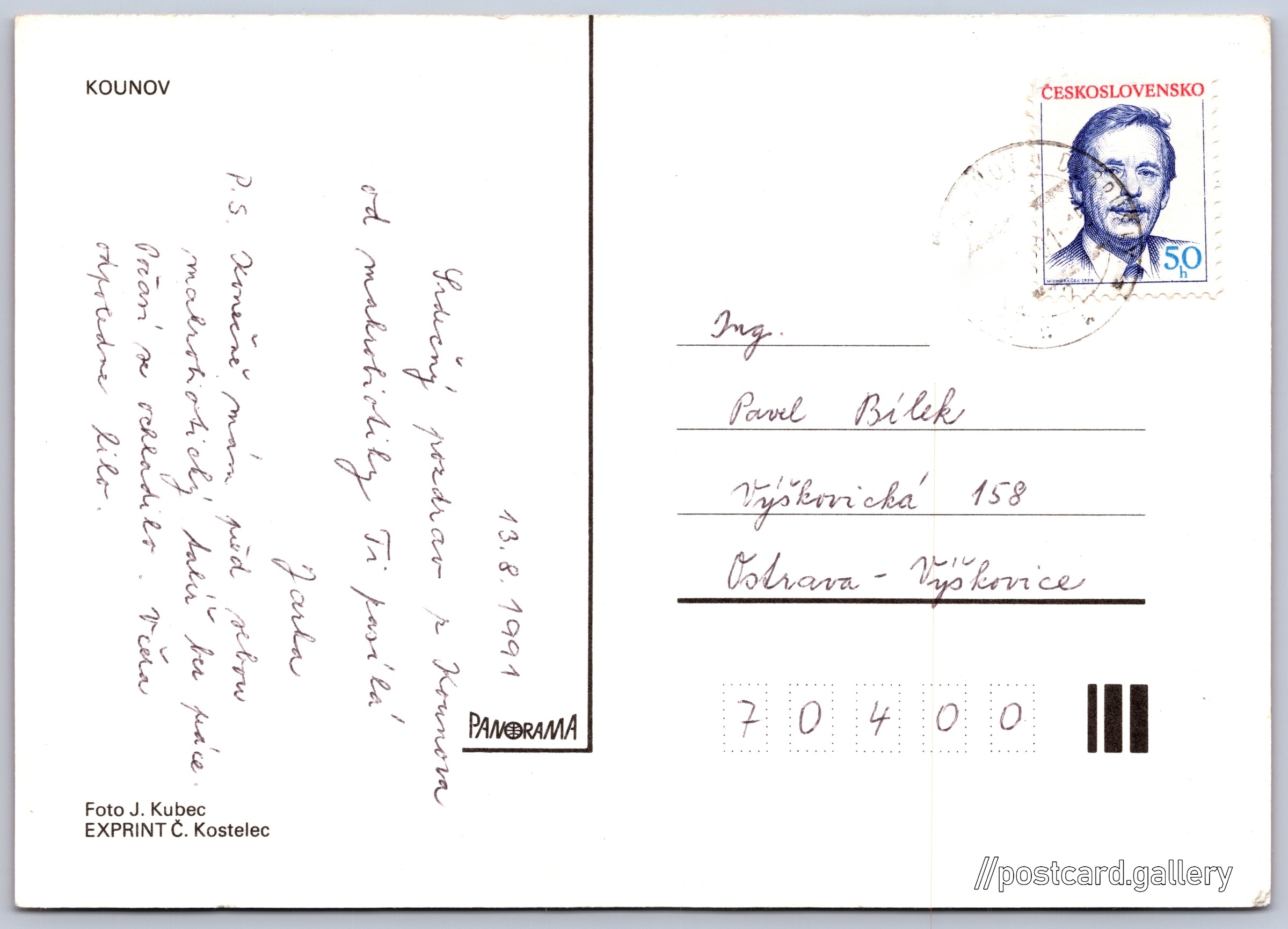 Kounov Pokud chcete vidět pohlednice ve vyšším rozlišení nebo zobrazovat jejich zadní stranu, tak se prosím nejdříve přihlašte Přihlásit Zaregistrovat Kounov KOUNOV Jazyk tištěného textu na pohlednici: čeština Kounov 16, 517 92 Kounov, Czechia ukázat na mapě Vydavatel: Panorama (Československo) Odhadované datum vydání pohlednice: 1988 - 1991 Pomozte nám zpřesnit rok vzniku pohlednice Velikost (š x v) a tvar pohlednice: 148 x 105 mm (5.83" x 4.13"), obdélník Osoby spjaté s touto pohlednicí: Jaroslav Kubec(Autor fotografie) Prošlá poštou:Datum napsání pohledu: 13.8.1991 Ceny: Vyplacené známky: 0,50 Kčs (CSK) DiskuseVložit příspěvek Přidat novou složku ... Spravovat složky ...