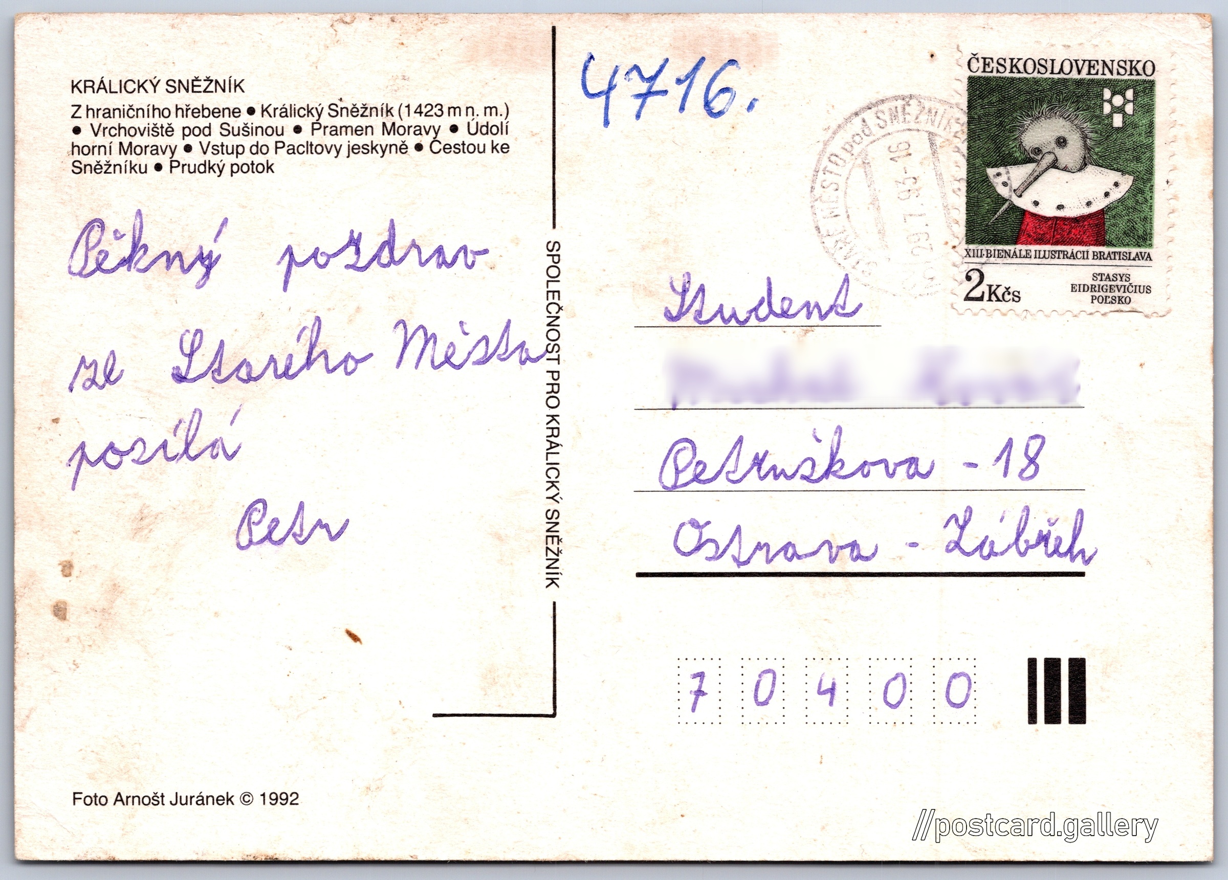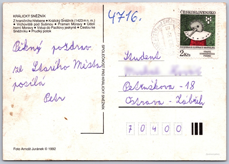 Králický Sněžník 1/2 Pokud chcete vidět pohlednice ve vyšším rozlišení nebo zobrazovat jejich zadní stranu, tak se prosím nejdříve přihlašte Přihlásit Zaregistrovat SPOLEČNOST PRO KRÁLICKÝ SNĚŽNÍK 1423 KRÁLICKÝ SNĚŽNÍK- Z hraničního hřebene- Králický Sněžník (1423 m n. m.)- Vrchoviště pod Sušinou- Pramen Moravy- Údolí horní Moravy- Vstup do Pacitovy jeskyně- Cestou ke Sněžníku- Prudký potok Jazyk tištěného textu na pohlednici: čeština Králický Sněžník (1423 m), Hora, výškový bod, Dolní Morava, Česko ukázat na mapě Vydavatel: Společnost pro Králický Sněžník (Československo) Rok vydání pohlednice: 1992 Velikost (š x v) a tvar pohlednice: 147 x 104 mm (5.79" x 4.09"), obdélník Osoby spjaté s touto pohlednicí: Arnošt Juránek(Autor fotografie) Prošlá poštou:Datum na razítku: 29.7.1993 Ceny: Vyplacené známky: 2,00 Kčs (CSK) DiskuseVložit příspěvek Přidat novou složku ... Spravovat složky ...