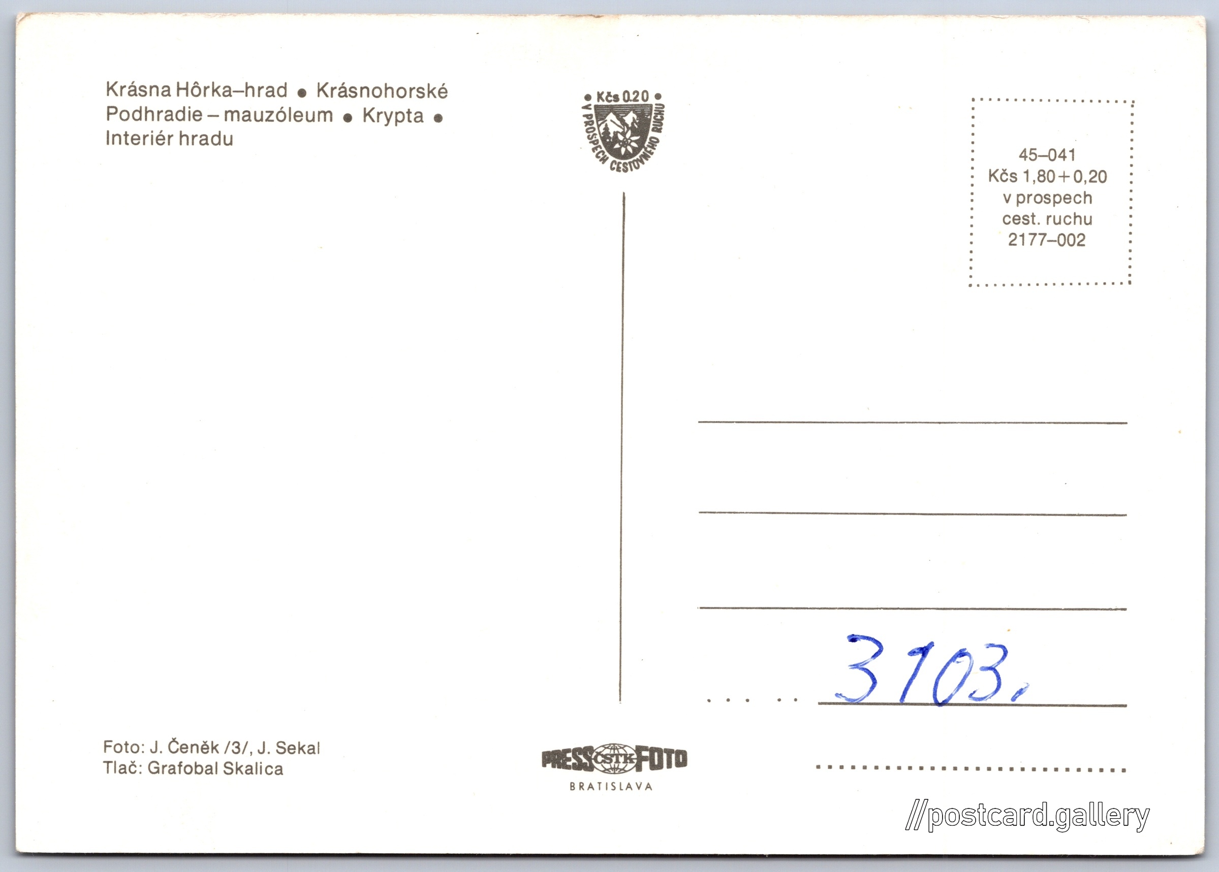 Cena pohlednice: 1,80 Kčs (CSK) (+0,20 Kčs přípl. na tur. ruch)