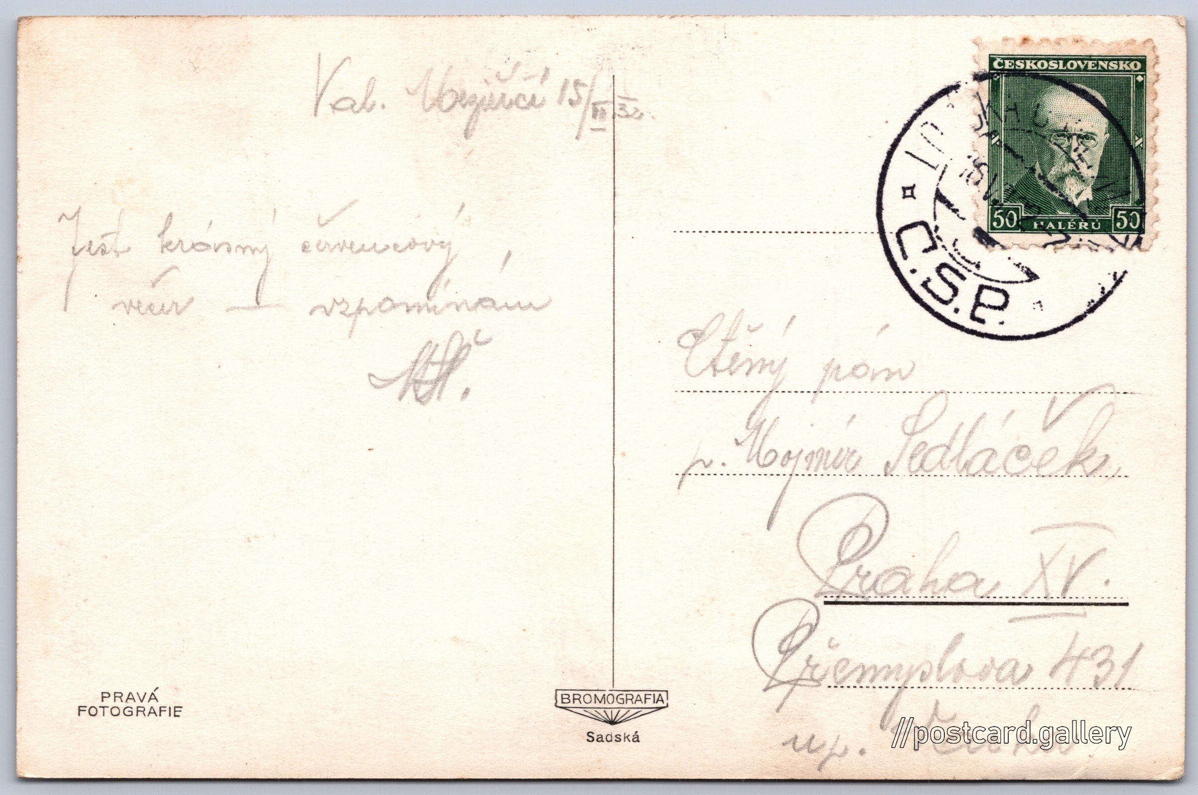 Krásno nad Bečvou, obora Pokud chcete vidět pohlednice ve vyšším rozlišení nebo zobrazovat jejich zadní stranu, tak se prosím nejdříve přihlašte Přihlásit Zaregistrovat Krásno n/BečObora PRAVÁ FOTOGRAFIE Jazyk tištěného textu na pohlednici: čeština Krásno nad Bečvou, Valašské Meziříčí, Vsetín ukázat na mapě V blízkém okolí místa zobrazeného na pohlednici lze najít 4 jiné pohlednice. Zobrazit blízké pohlednice Vydavatel: Bromografia Sadská (Československo) Odhadované datum vydání pohlednice: 1929 - 1932 Pomozte nám zpřesnit rok vzniku pohlednice Velikost (š x v) a tvar pohlednice: 136 x 90 mm (5.35" x 3.54"), obdélník Prošlá poštou:Datum na razítku: 16.7.1932Datum napsání pohledu: 15.7.1932 Ceny: Vyplacené známky: 0,50 Kčs (CSK) DiskuseVložit příspěvek Přidat novou složku ... Spravovat složky ...
