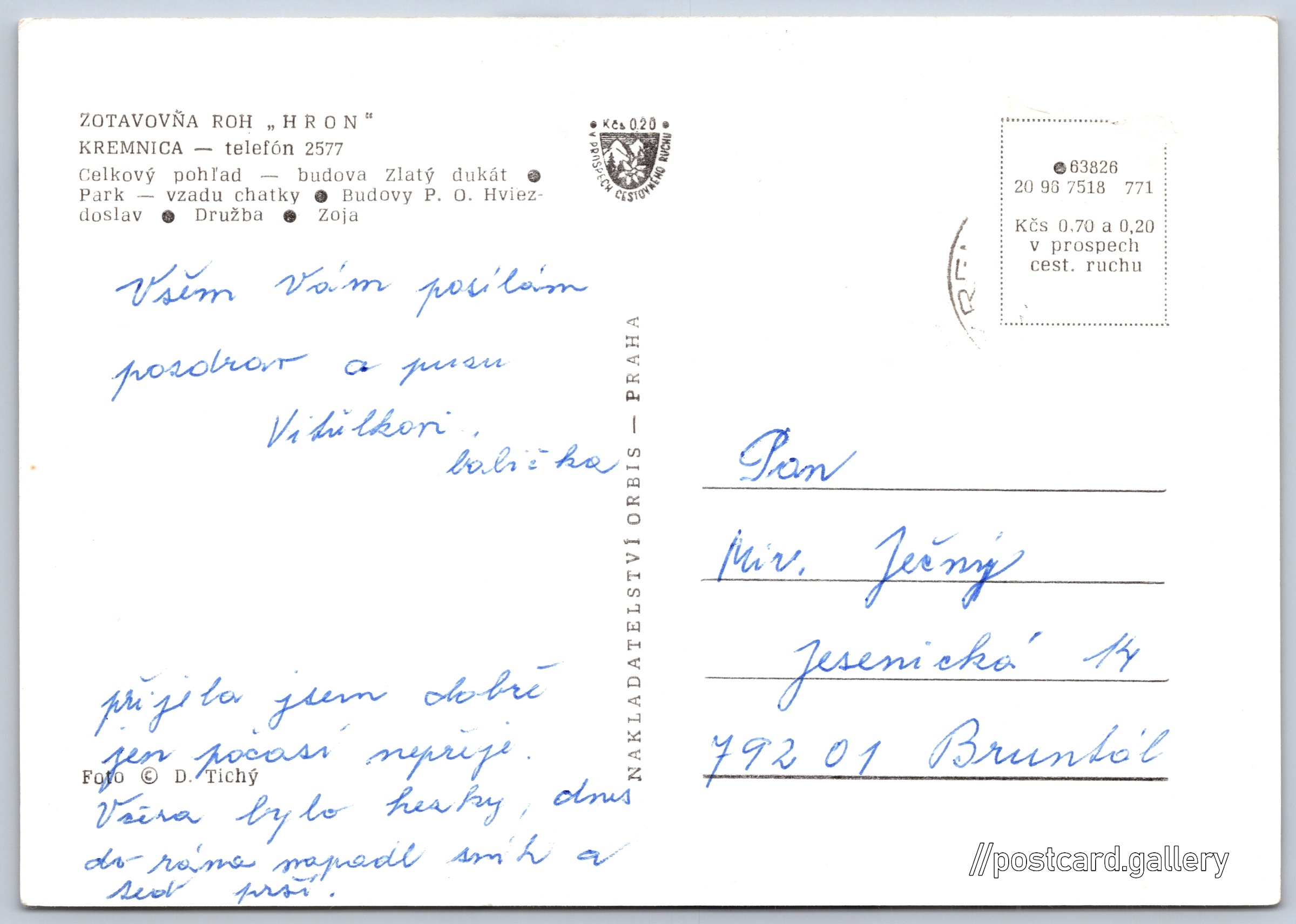 Kremnica, zotavovna Hron Pokud chcete vidět pohlednice ve vyšším rozlišení nebo zobrazovat jejich zadní stranu, tak se prosím nejdříve přihlašte Přihlásit Zaregistrovat KremnicaZotavovňa Hron ZOTAVOVŇA ROH "HRON"KREMNICA - telefón 2577- Celkový pohľad - budova Zlatý dukát- Park - vzadu chatky Budovy- P. O. Hviezdoslav- Družba- Zoja Jazyk tištěného textu na pohlednici: slovenština Partizánska dolina 527/13 ukázat na mapě Vydavatel: Nakladatelství Orbis (Československo) Rok vydání pohlednice: červenec, 1971 Velikost (š x v) a tvar pohlednice: 146 x 103 mm (5.75" x 4.06"), obdélník Osoby spjaté s touto pohlednicí: Dušan Tichý(Autor fotografie) Prošlá poštou Ceny: Cena pohlednice: 0,70 Kčs (CSK) (+0,20 Kčs přípl. na tur. ruch) Kódy na pohlednici: •63826 20 96 7518 771 DiskuseVložit příspěvek Přidat novou složku ... Spravovat složky ...