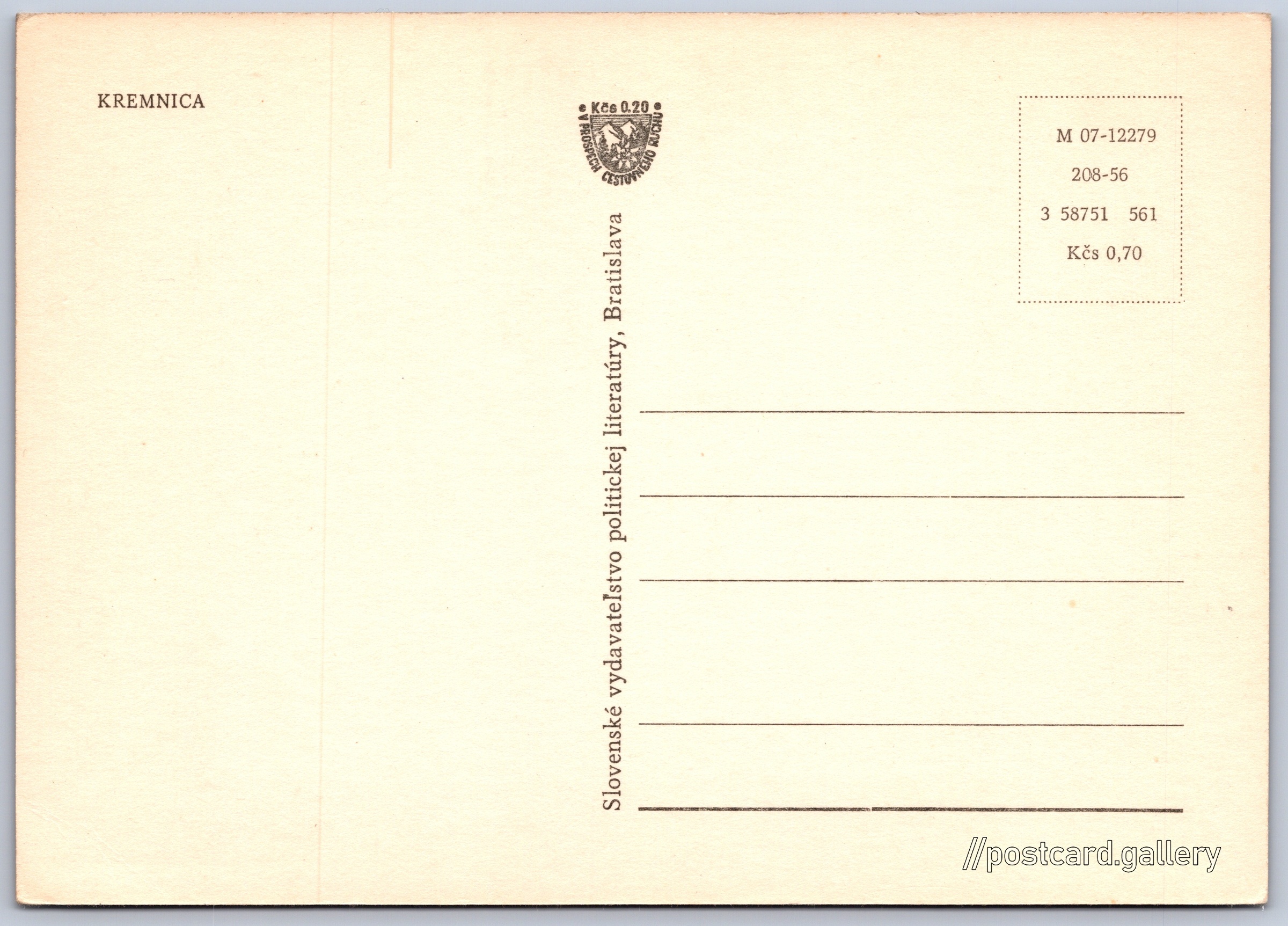 Cena pohlednice: 0,70 Kčs (CSK) (+0,20 Kčs přípl. na tur. ruch)