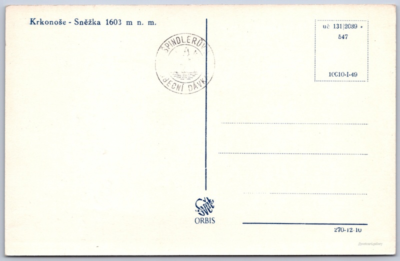 Krkonoš, Sněžka Pokud chcete vidět pohlednice ve vyšším rozlišení nebo zobrazovat jejich zadní stranu, tak se prosím nejdříve přihlašte Přihlásit Zaregistrovat Krkonoše - Sněžka 1603 m n. m. Jazyk tištěného textu na pohlednici: čeština Pec pod Sněžkou, Trutnov ukázat na mapě V blízkém okolí místa zobrazeného na pohlednici lze najít 42 jiných pohlednic. Zobrazit blízké pohlednice Vydavatel: Nakladatelství Orbis (Československo) Datum vydání není známo Pomozte nám odhadnout datum vzniku pohlednice Velikost (š x v) a tvar pohlednice: 140 x 90 mm (5.51" x 3.54"), obdélník Čistá pohlednice (neprošlá poštou) Kódy na pohlednici: uc 131|2039 547 10010-I-49 270-12-10 1603 DiskuseVložit příspěvek Přidat novou složku ... Spravovat složky ...