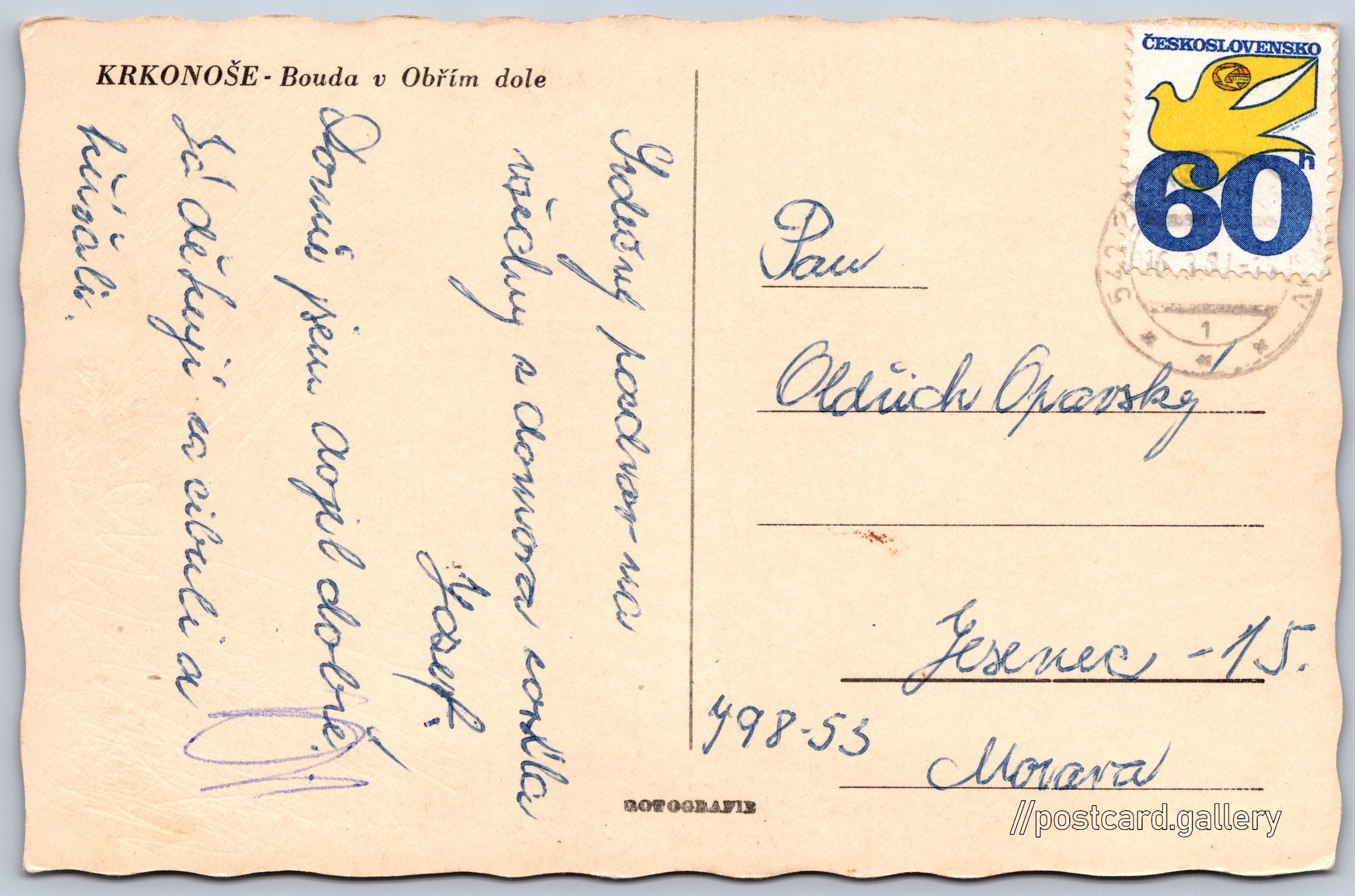 Krkonoše, bouda v Obřím dole Pokud chcete vidět pohlednice ve vyšším rozlišení nebo zobrazovat jejich zadní stranu, tak se prosím nejdříve přihlašte Přihlásit Zaregistrovat KRKONOŠE - Bouda v Obřím dole Jazyk tištěného textu na pohlednici: čeština Bouda v Obřím dole, Pec pod Sněžkou 116, Pec pod Sněžkou, Česko ukázat na mapě V blízkém okolí místa zobrazeného na pohlednici lze najít 43 jiných pohlednic. Zobrazit blízké pohlednice Datum vydání není známo Pomozte nám odhadnout datum vzniku pohlednice Velikost (š x v) a tvar pohlednice: 138 x 91 mm (5.43" x 3.58"), obdélník, zoubkovaný Prošlá poštou:Datum na razítku: 16.3.1981 Ceny: Vyplacené známky: 0,60 Kčs (CSK) DiskuseVložit příspěvek Přidat novou složku ... Spravovat složky ...