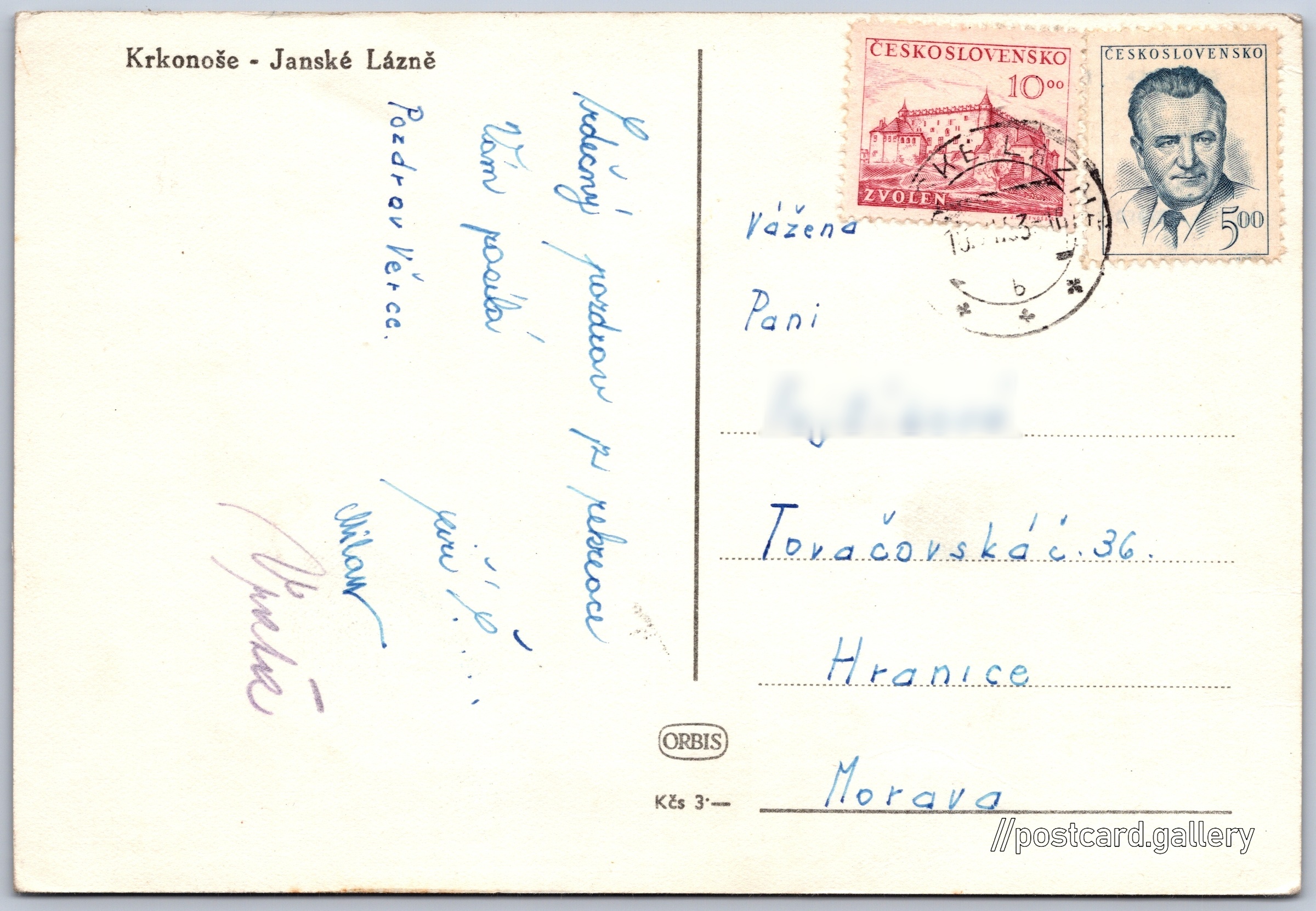 Krkonoše, Janské lázně Pokud chcete vidět pohlednice ve vyšším rozlišení nebo zobrazovat jejich zadní stranu, tak se prosím nejdříve přihlašte Přihlásit Zaregistrovat Krkonoše - Janské Lázně Jazyk tištěného textu na pohlednici: čeština náměstí Svobody, Janské Lázně, Trutnov ukázat na mapě V blízkém okolí místa zobrazeného na pohlednici lze najít 18 jiných pohlednic. Zobrazit blízké pohlednice Vydavatel: Nakladatelství Orbis (Československo) Odhadované datum vydání pohlednice: 1950 - 1953 Pomozte nám zpřesnit rok vzniku pohlednice Velikost (š x v) a tvar pohlednice: 148 x 100 mm (5.83" x 3.94"), obdélník Prošlá poštou:Datum na razítku: 18.6.1953 Ceny: Cena pohlednice: 3,00 Kčs (CSK)Vyplacené známky: 15,00 Kčs (CSK) DiskuseVložit příspěvek Přidat novou složku ... Spravovat složky ...