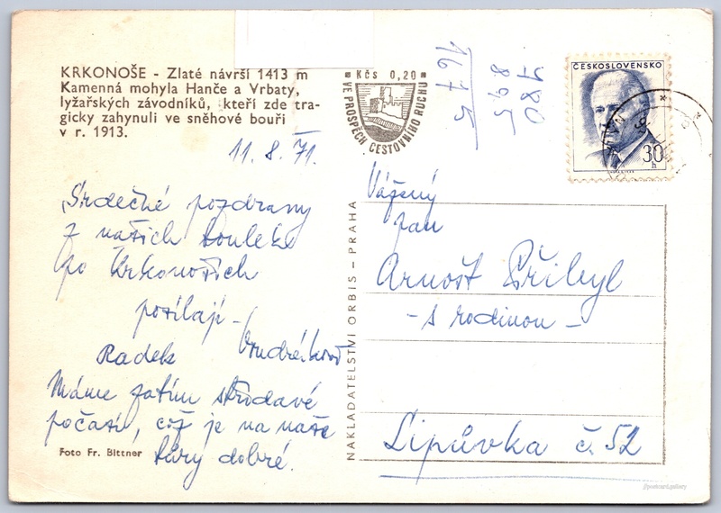 Krkonoše, kamenná mohyla Hanče a Vrbaty Pokud chcete vidět pohlednice ve vyšším rozlišení nebo zobrazovat jejich zadní stranu, tak se prosím nejdříve přihlašte Přihlásit Zaregistrovat KRKONOŠE - Zlaté návrší 1413 mKamenná mohyla Hanče a Vrbaty, lyžařských závodníků, kteří zde tragicky zahynuli ve sněhové bouři v r. 1913. Jazyk tištěného textu na pohlednici: čeština Vítkovice 1, 512 38 Vítkovice, Czechia ukázat na mapě V blízkém okolí místa zobrazeného na pohlednici lze najít 16 jiných pohlednic. Zobrazit blízké pohlednice Vydavatel: Nakladatelství Orbis (Československo) Odhadované datum vydání pohlednice: 1968 - 1971 Pomozte nám zpřesnit rok vzniku pohlednice Velikost (š x v) a tvar pohlednice: 147 x 103 mm (5.79" x 4.06"), obdélník Osoby spjaté s touto pohlednicí: Fr. Bittner(Autor fotografie) Bohumil Hanč(Obsah pohlednice) Václav Vrbata(Obsah pohlednice) Prošlá poštou:Datum na razítku: 11.8.1971Datum napsání pohledu: 11.8.1971 Ceny: Příplatek na tur. ruch: 0,20 Kčs (CSK))Vyplacené známky: 0,30 Kčs (CSK) DiskuseVložit příspěvek Přidat novou složku ... Spravovat složky ...