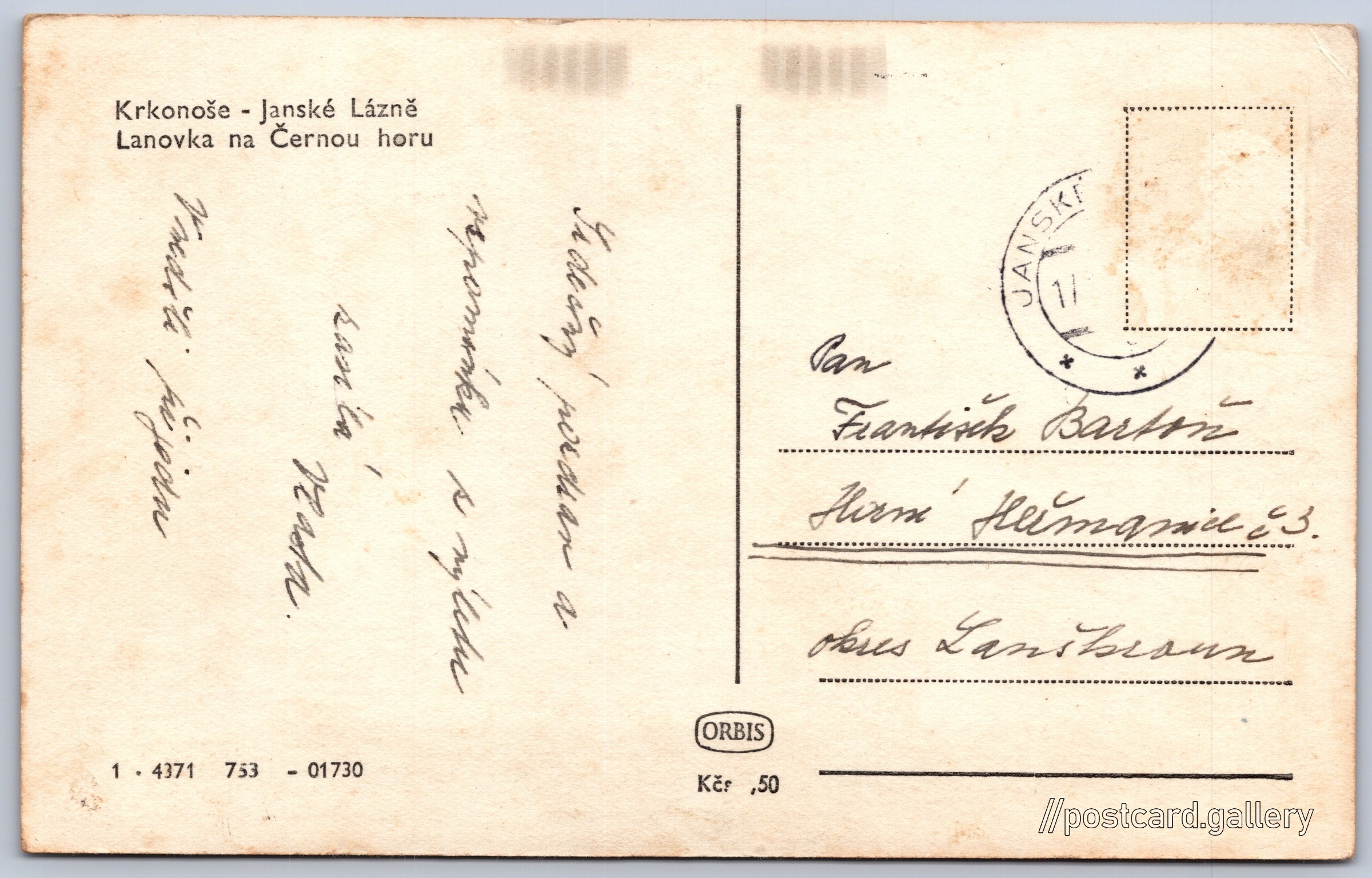 Krkonoše, lanovka na Černou horu Pokud chcete vidět pohlednice ve vyšším rozlišení nebo zobrazovat jejich zadní stranu, tak se prosím nejdříve přihlašte Přihlásit Zaregistrovat Krkonoše - Janské LázněLanovka na Černou horu Jazyk tištěného textu na pohlednici: čeština Janské Lázně, Trutnov ukázat na mapě V blízkém okolí místa zobrazeného na pohlednici lze najít 20 jiných pohlednic. Zobrazit blízké pohlednice Vydavatel: Nakladatelství Orbis (Československo) Rok vydání pohlednice: červenec, 1953 Velikost (š x v) a tvar pohlednice: 138 x 88 mm (5.43" x 3.46"), obdélník Prošlá poštou Ceny: Cena pohlednice: 0,50 Kčs (CSK) Kódy na pohlednici: 1-4371 753 01730 DiskuseVložit příspěvek Přidat novou složku ... Spravovat složky ...
