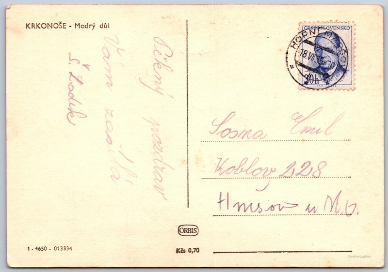Krkonoše, Modrrý důl 8/25 Pokud chcete vidět pohlednice ve vyšším rozlišení nebo zobrazovat jejich zadní stranu, tak se prosím nejdříve přihlašte Přihlásit Zaregistrovat KRKONOŠE - Modrý důl Jazyk tištěného textu na pohlednici: čeština Modrý důl, Kaňon, rokle, soutěska, údolí, Pec pod Sněžkou, Česko ukázat na mapě V blízkém okolí místa zobrazeného na pohlednici lze najít 43 jiných pohlednic. Zobrazit blízké pohlednice Vydavatel: Nakladatelství Orbis (Československo) Odhadované datum vydání pohlednice: 1952 - 1955 Pomozte nám zpřesnit rok vzniku pohlednice Velikost (š x v) a tvar pohlednice: 147 x 102 mm (5.79" x 4.02"), obdélník Prošlá poštou:Datum na razítku: 18.7.1955 Ceny: Cena pohlednice: 0,70 Kčs (CSK)Vyplacené známky: 0,30 Kčs (CSK) Kódy na pohlednici: 1-4650 013334 DiskuseVložit příspěvek Přidat novou složku ... Spravovat složky ...