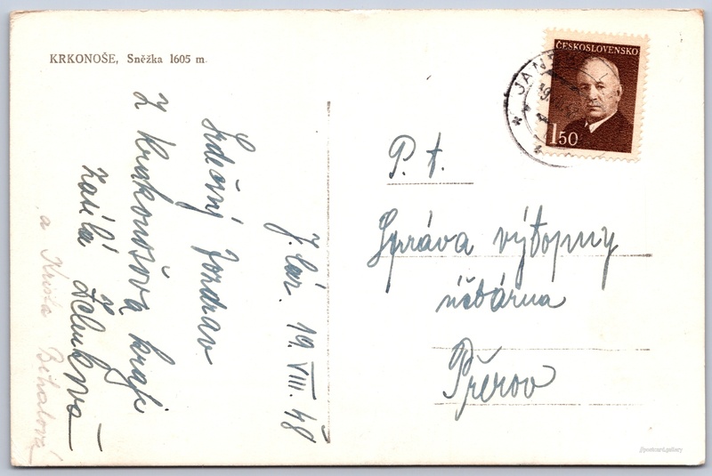 Krkonoše, Sněžka Pokud chcete vidět pohlednice ve vyšším rozlišení nebo zobrazovat jejich zadní stranu, tak se prosím nejdříve přihlašte Přihlásit Zaregistrovat KRKONOŠE, Sněžka 1605 m. Jazyk tištěného textu na pohlednici: čeština Sněžka (1603 m), Hora, výškový bod, Pec pod Sněžkou, Česko ukázat na mapě V blízkém okolí místa zobrazeného na pohlednici lze najít 42 jiných pohlednic. Zobrazit blízké pohlednice Odhadované datum vydání pohlednice: 1945 - 1948 Pomozte nám zpřesnit rok vzniku pohlednice Velikost (š x v) a tvar pohlednice: 140 x 92 mm (5.51" x 3.62"), obdélník Prošlá poštou:Datum na razítku: 19.8.1948Datum napsání pohledu: 19.8.1948 Ceny: Vyplacené známky: 1,50 Kčs (CSK) DiskuseVložit příspěvek Přidat novou složku ... Spravovat složky ...