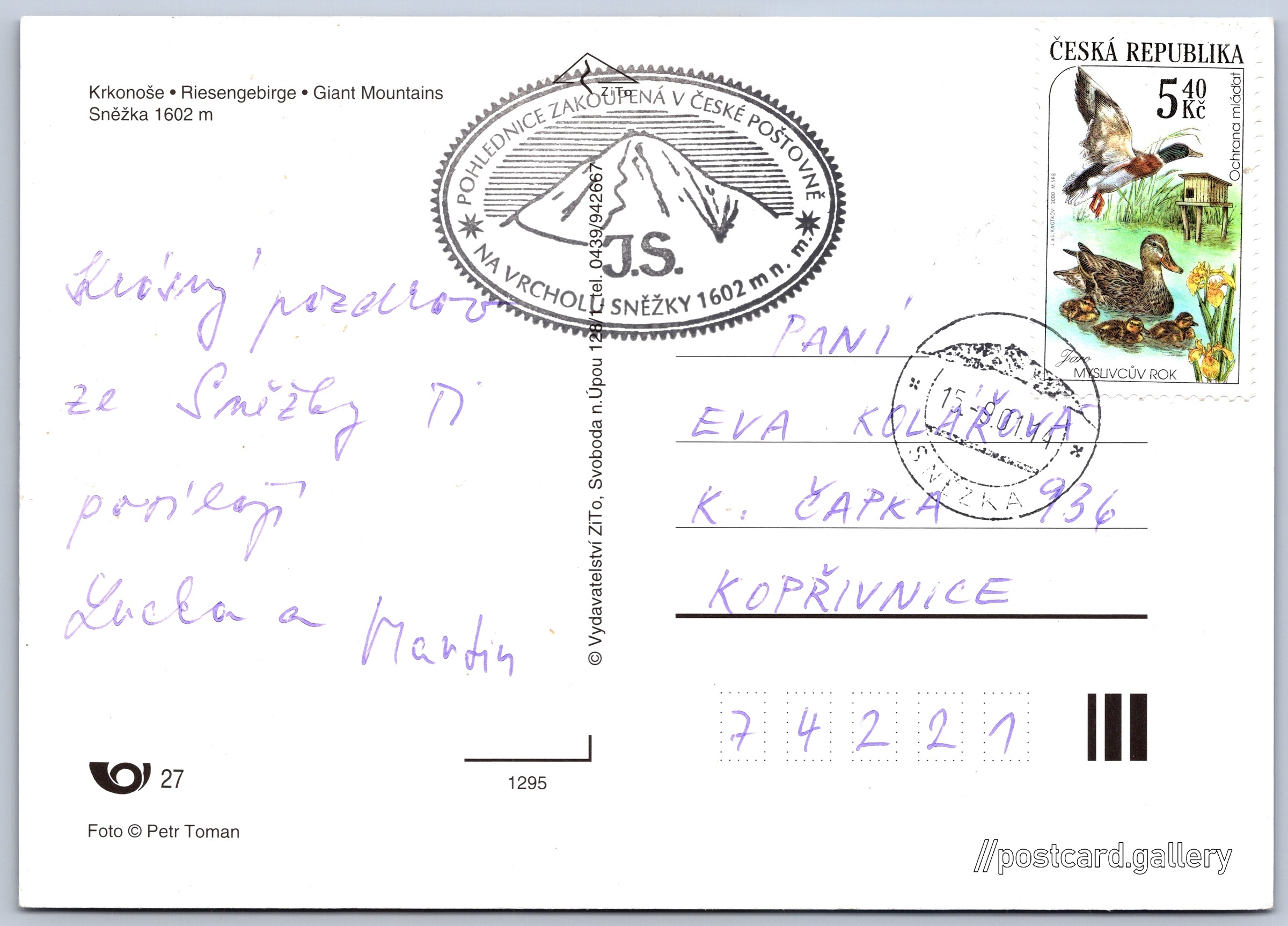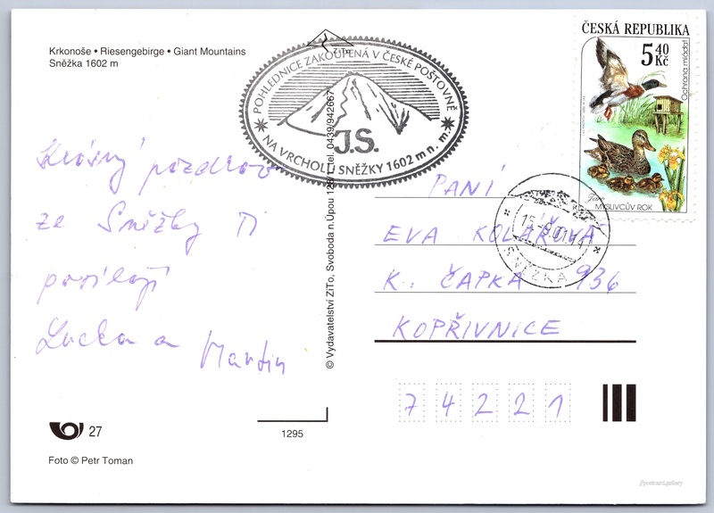 Krkonoše, Sněžka Pokud chcete vidět pohlednice ve vyšším rozlišení nebo zobrazovat jejich zadní stranu, tak se prosím nejdříve přihlašte Přihlásit Zaregistrovat Krkonoše - Riesengebirge - Giant MountainsSněžka 1602 m Jazyky tištěného textu na pohlednici: čeština, němčina, angličtina Sněžka (1603 m), Hora, výškový bod, Pec pod Sněžkou, Česko ukázat na mapě V blízkém okolí místa zobrazeného na pohlednici lze najít 47 jiných pohlednic. Zobrazit blízké pohlednice Odhadované datum vydání pohlednice: 1998 - 2001 Pomozte nám zpřesnit rok vzniku pohlednice Velikost (š x v) a tvar pohlednice: 148 x 105 mm (5.83" x 4.13"), obdélník Osoby spjaté s touto pohlednicí: Petr Toman(Autor fotografie) Prošlá poštou:Datum na razítku: 15.9.2001 Ceny: Vyplacené známky: 5,40 Kč (CZK) Kódy na pohlednici: 1295 DiskuseVložit příspěvek Přidat novou složku ... Spravovat složky ...