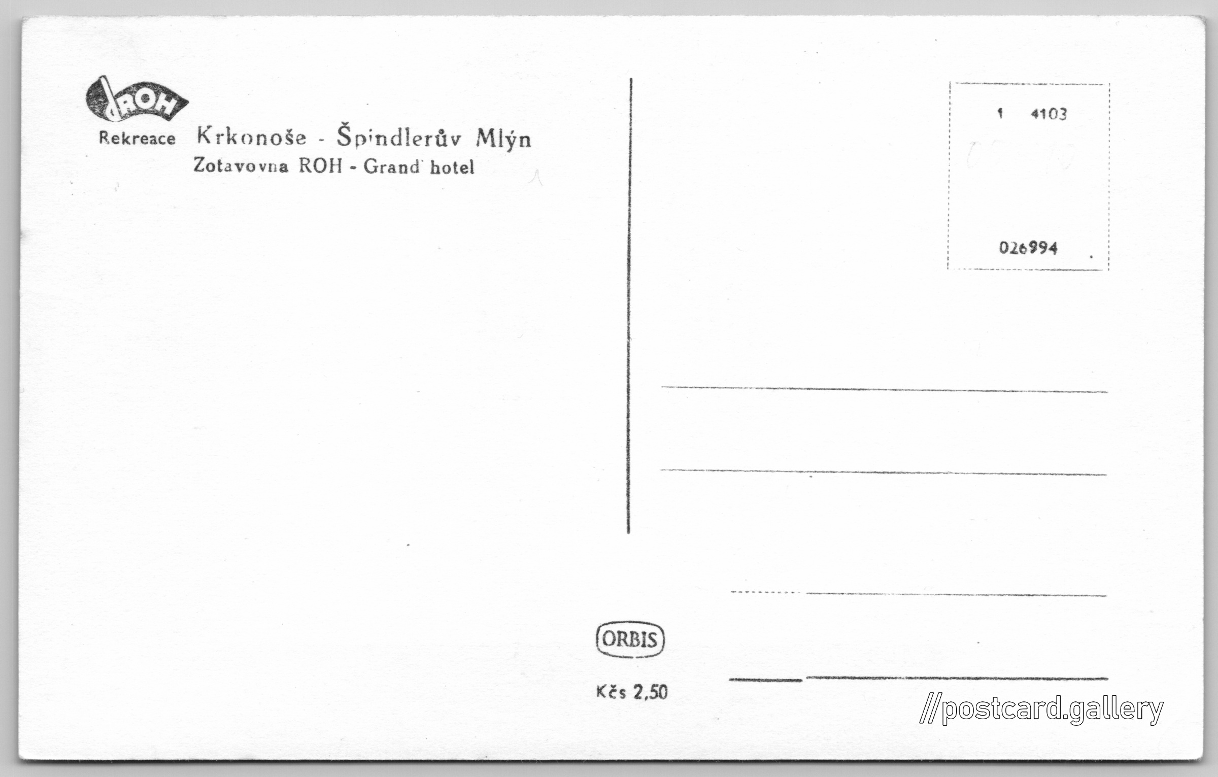 Krkonoše, Špindlerův Mlýn Pokud chcete vidět pohlednice ve vyšším rozlišení nebo zobrazovat jejich zadní stranu, tak se prosím nejdříve přihlašte Přihlásit Zaregistrovat ROH RekreaceKrkonoše - Špindlerův MlýnZotavovna ROH - Grand hotel Jazyk tištěného textu na pohlednici: čeština Hotel Grand, Špindlerův Mlýn 183, Špindlerův Mlýn, Česko ukázat na mapě V blízkém okolí místa zobrazeného na pohlednici lze najít 28 jiných pohlednic. Zobrazit blízké pohlednice Vydavatel: Nakladatelství Orbis (Československo) Odhadované datum vydání pohlednice: 1948 - 1953 Pomozte nám zpřesnit rok vzniku pohlednice Velikost (š x v) a tvar pohlednice: 139 x 88 mm (5.47" x 3.46"), obdélník Čistá pohlednice (neprošlá poštou) Ceny: Cena pohlednice: 2,50 Kčs (CSK) Kódy na pohlednici: 1 4103 026994 DiskuseVložit příspěvek Přidat novou složku ... Spravovat složky ...